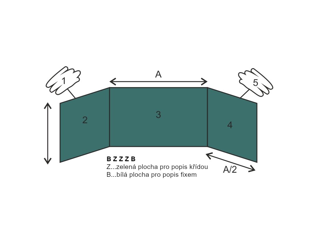 - Kombinace ploch pro popis fixem a křídou – zavřená tabule pro popis křídou (zelená), otevřená tabule křídla pro popis fixem (bílá) a střed pro popis fixem (bílá).