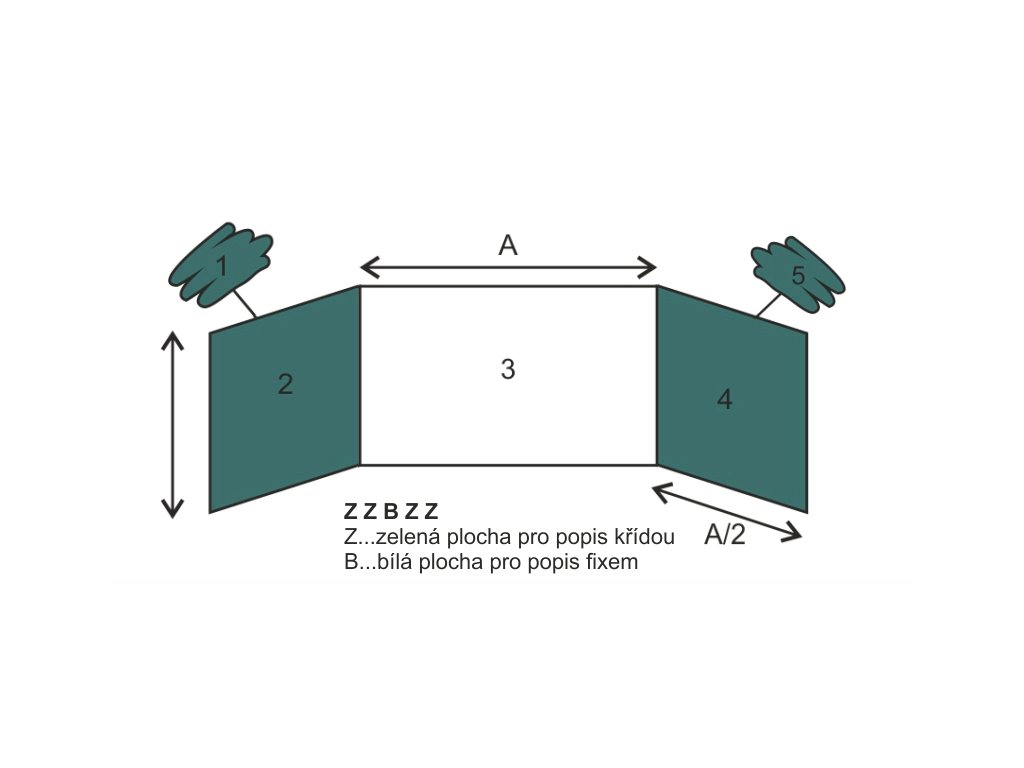 - Kombinace ploch pro popis fixem a křídou – zavřená tabule pro popis křídou (zelená), otevřená tabule křídla pro popis fixem (bílá) a střed pro popis fixem (bílá).
