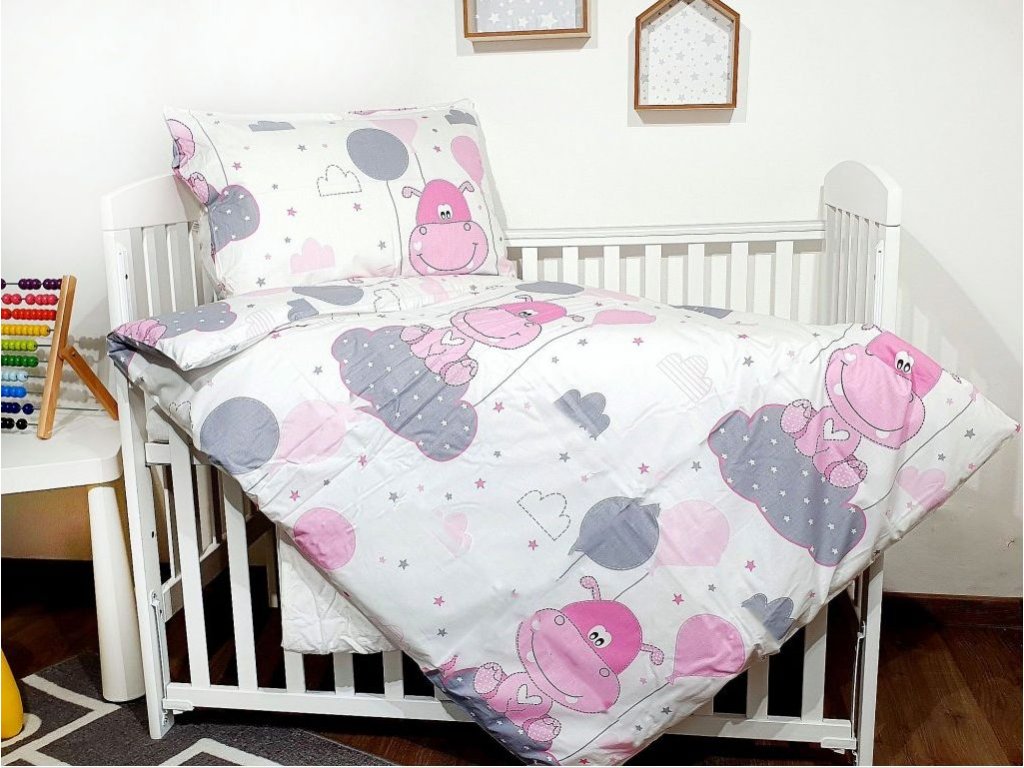 VÝHODNÁ NABÍDKA - 10 x SET - bavlněné povlečení do MŠ - Hrošík růžový