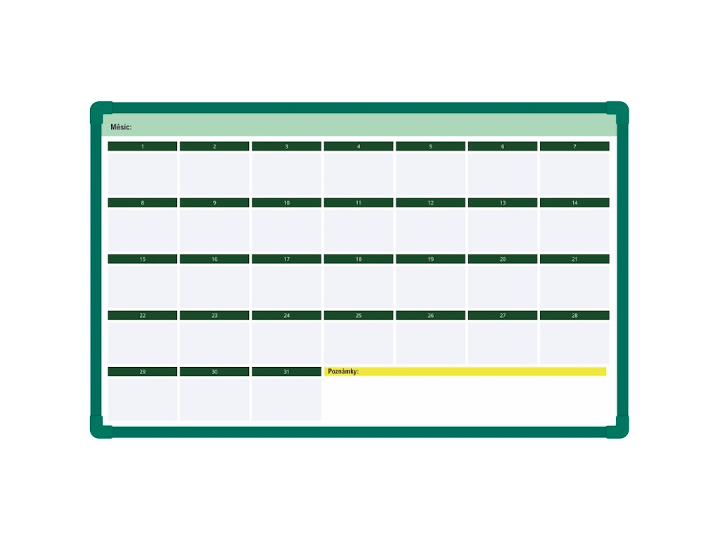 Bílá magnetická tabule s potiskem Kalendář a zeleným hliníkovým rámem doNOTE 64x40cm.