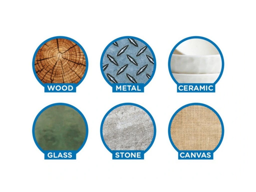 - Pro různé povrchy – dřevo, sklo, kov, kámen, keramika, papír, karton