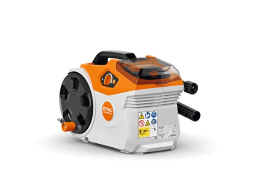 Myčka je poháněna silným akumulátorem z řady STIHL AK. V případě nedostupnosti vodovodní přípojky je možné využít volitelnou sací hadici pro práci v sacím režimu, například s dešťovou vodou. Alternativně lze použít přenosný vozík s 20litrovou nádrží na vodu, který je k dispozici jako příslušenství.