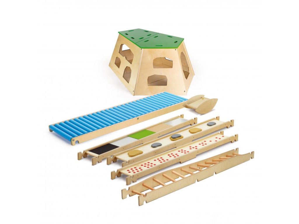 Obsahuje 7 kusů: základna, válečková klouzačka 205cm rovná, balanční lavička počítání, balanční lavička mix materiálů, balanční lavička kameny, balanční lavička žebřík vlna, Rocky Rocker.
