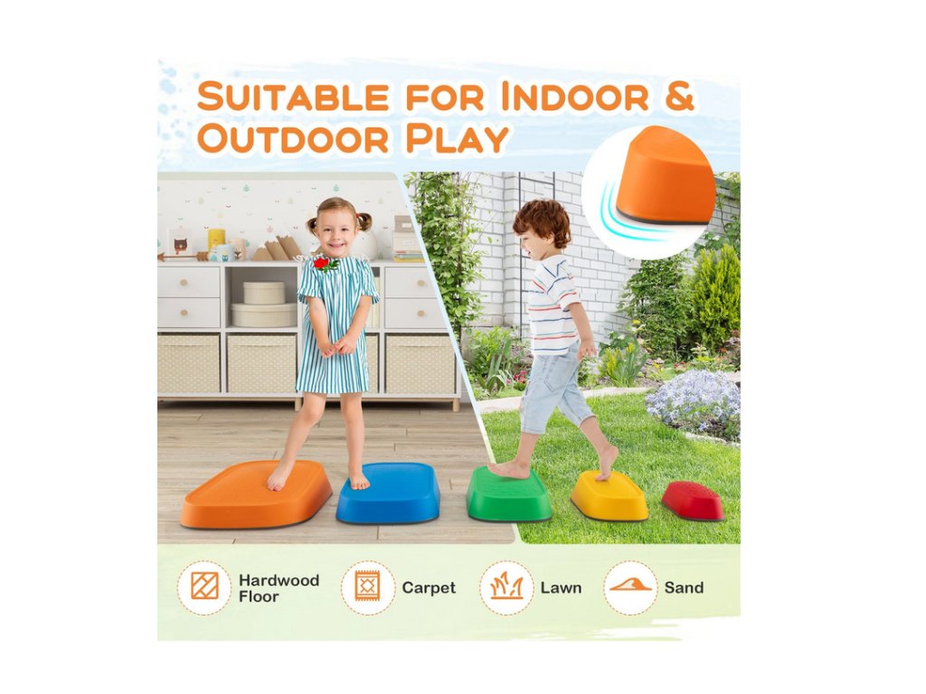 Balanční kameny lze používat jak v interiéru, tak venku na zahradě či hřišti. Jsou lehké, snadno se přenášejí a díky stohovatelné konstrukci zabírají minimum místa při skladování. Voděodolný povrch se jednoduše čistí a materiál je odolný vůči opotřebení.