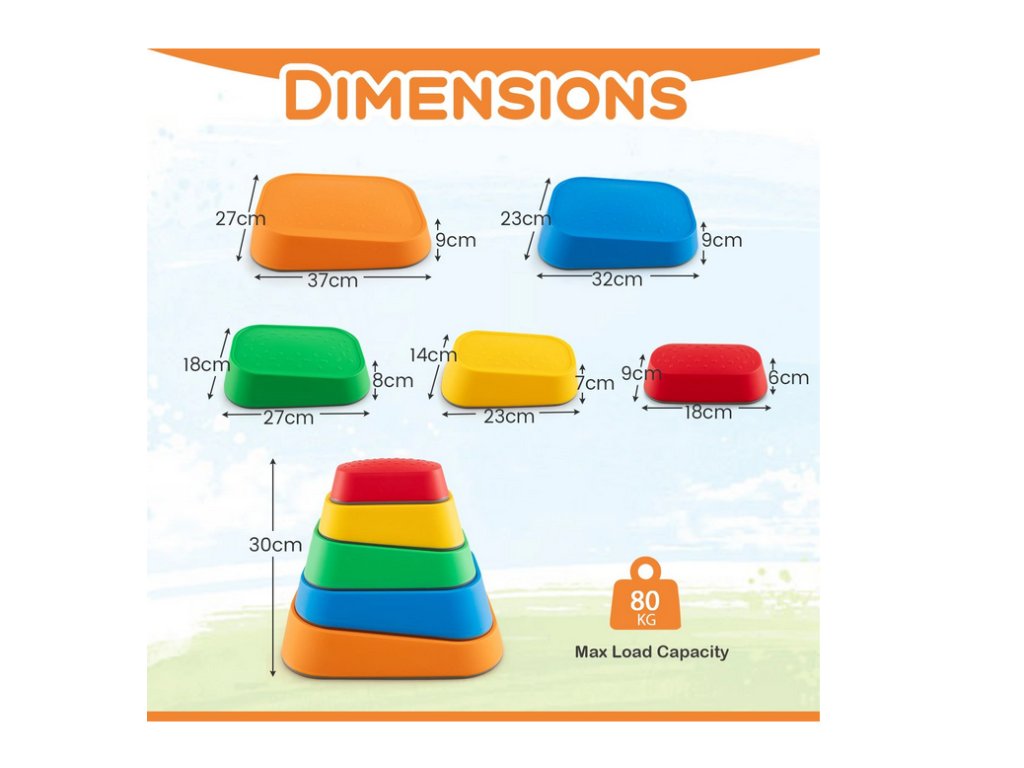 Každá sada obsahuje pět kusů kamenů různých výšek (6 / 7,5 / 8 / 9 / 9 cm) a barev. Celkové rozměry jednoho kamene jsou přibližně 36,5 × 27 × 28 cm. Produkt je vhodný pro děti od 3 let a díky své nosnosti nabízí univerzální využití při hře i tréninku rovnováhy.