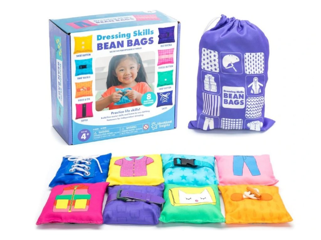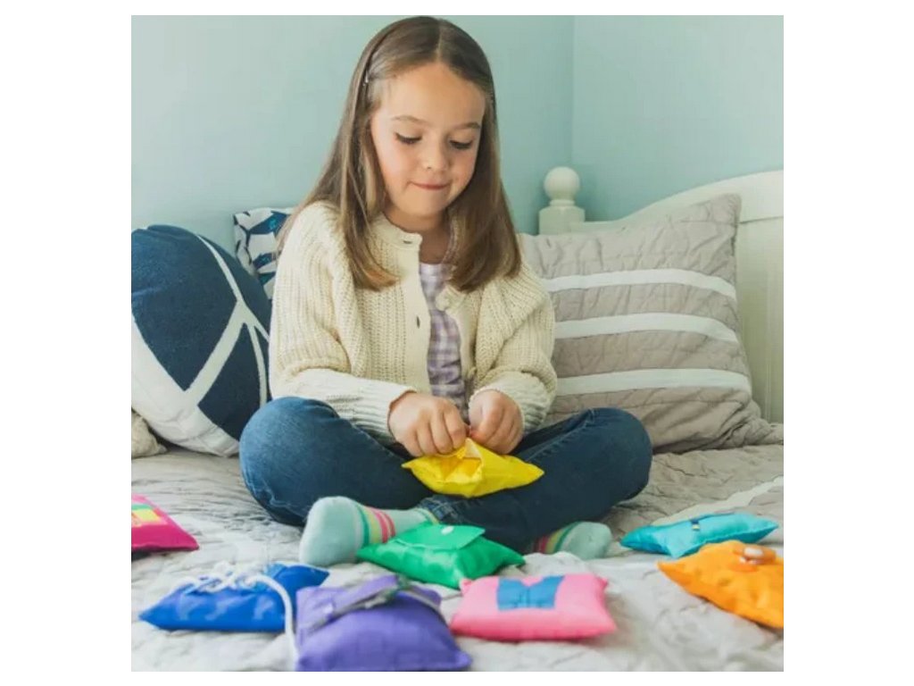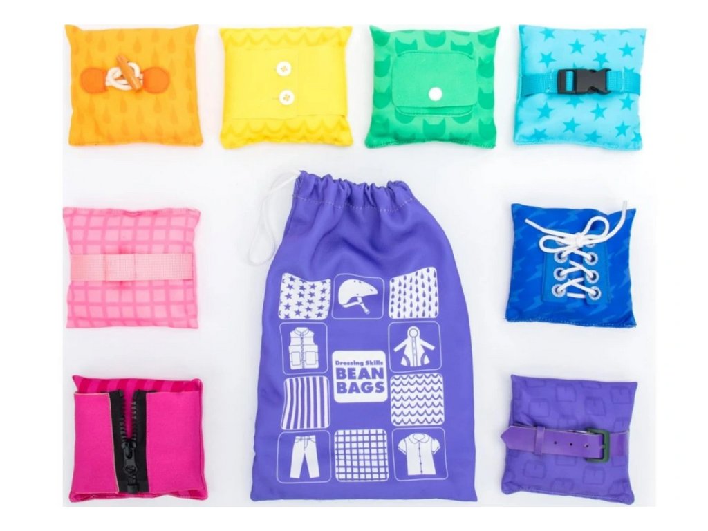 Sada měkkých pytlíčků, která učí děti základním dovednostem při oblékání a rozvíjí jemnou motoriku. Hravý způsob, jak se naučit zapínat knoflíky, zipy a další zapínání.