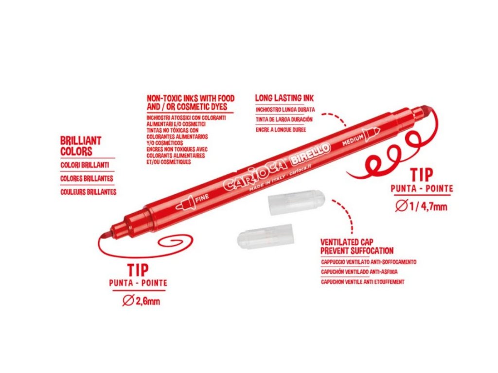 Carioca Birello box 24 ks je všestranná sada oboustranných fixů, která nabízí maximální kreativitu a pohodlí. Každý fix je vybaven dvěma hroty: jemným hrotem pro detaily a jemné linie a silnějším hrotem pro ploché vybarvování a silnější tahy. Tato kombinace umožňuje širokou škálu uměleckých technik, od precizních ilustrací až po výrazné plakátové kresby.