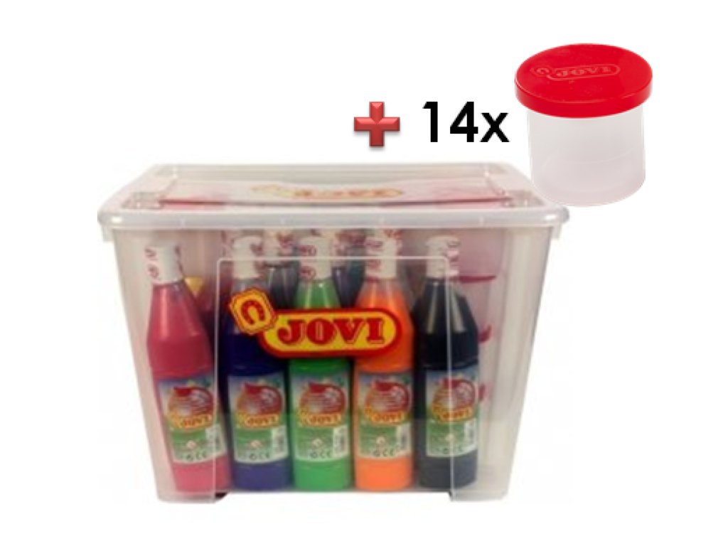 Kompletní sada temperových barev JOVI PREMIUM v praktickém plastovém boxu. Box obsahuje 14 kusů temperových barev nejvyšší kvality PREMIUM v objemu 0,5 l v mixu barev, 14 bezpečnostních kelímků a plastový box zdarma pro pohodlné skladování a přenášení.