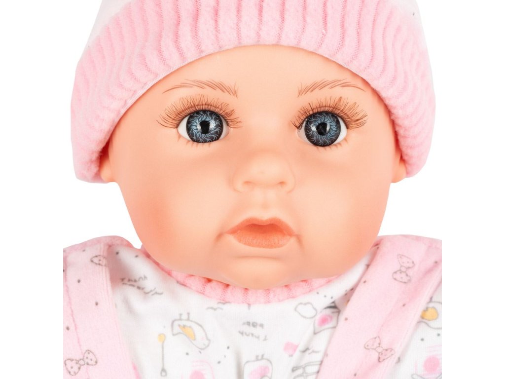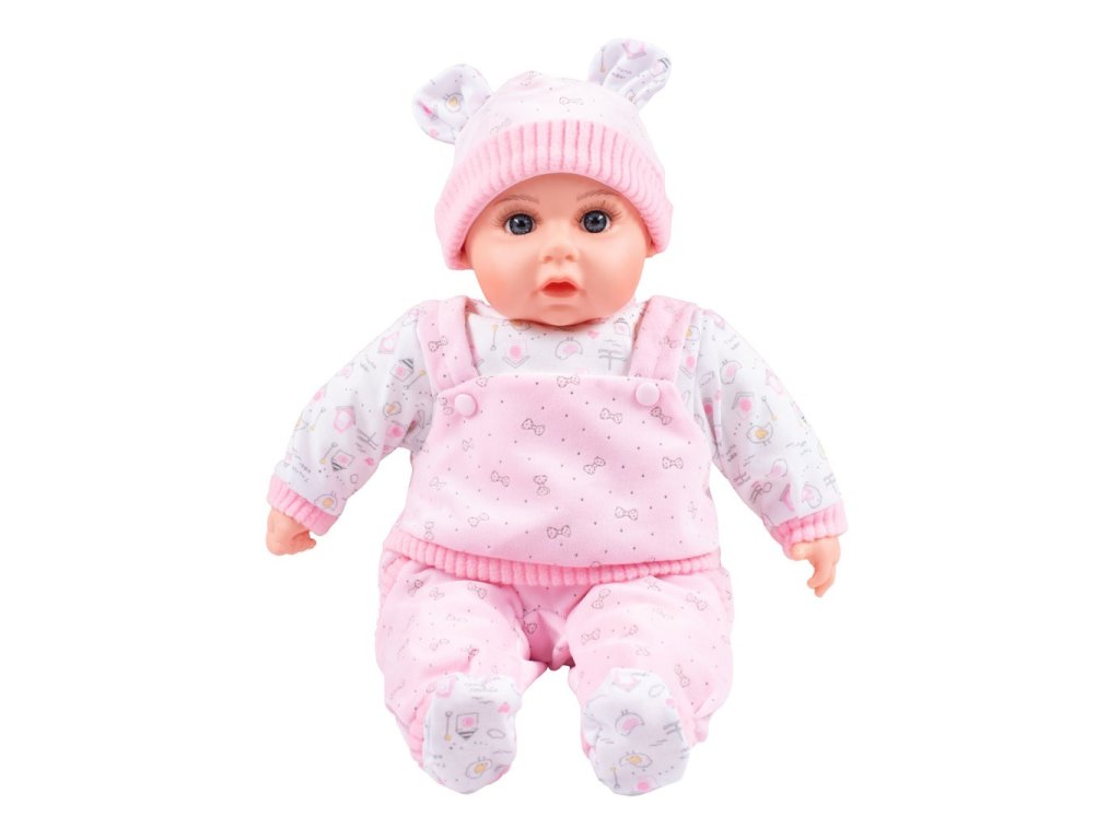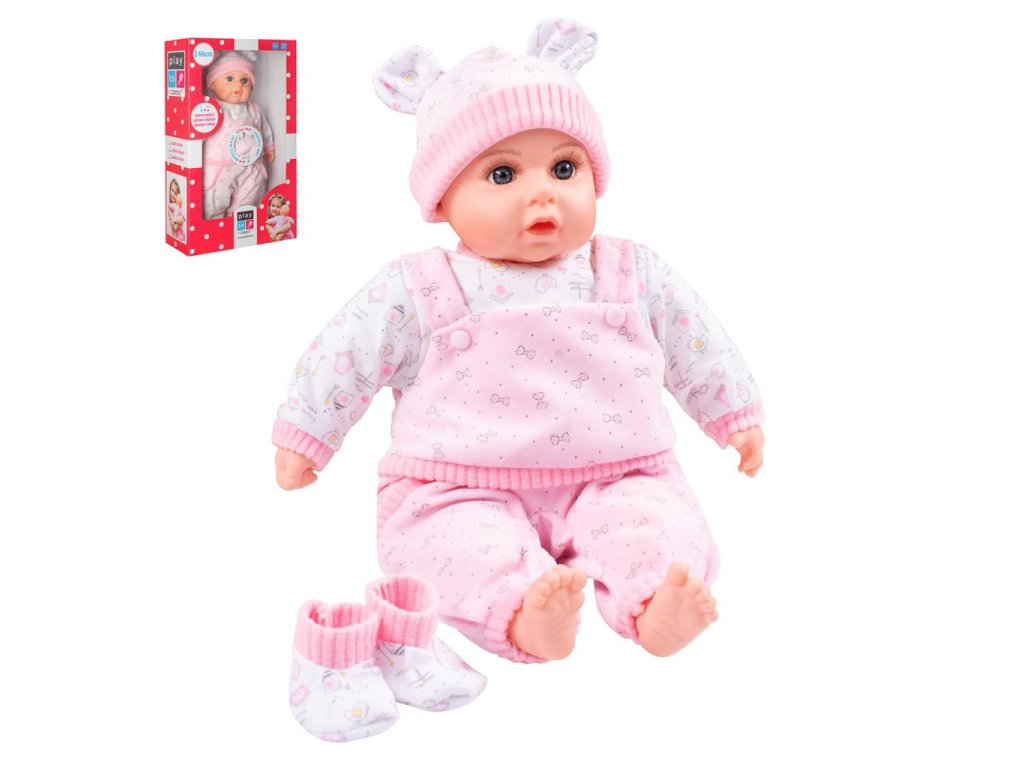 Dětská panenka PlayTo. Hlava, ruce a nohy jsou vyrobeny z gumy, tělíčko pak z měkkého materiálu. Panenka má milou tvářičku, která vypadá jak opravdové miminko. Délka panenky je 46 cm a je zabalená v krásné, barevné krabici. Panenka má česky mluvící modul, který se nachází v kapsičce na bříšku. Modul po stisknutí přehrává 5 písní a mluví 14 českých vět.