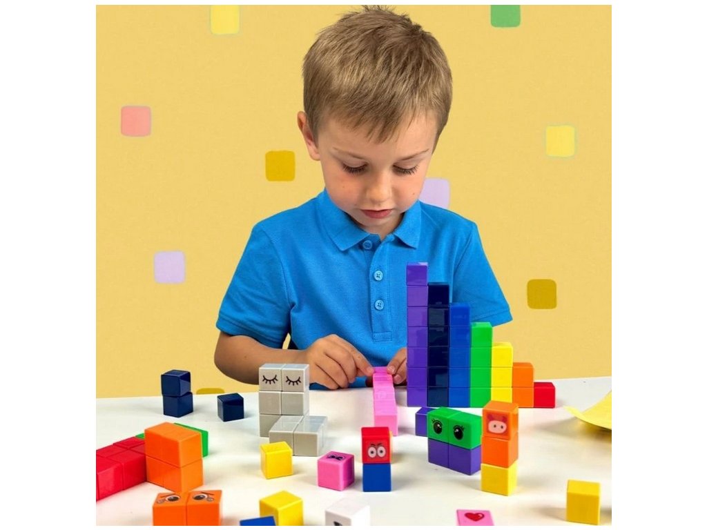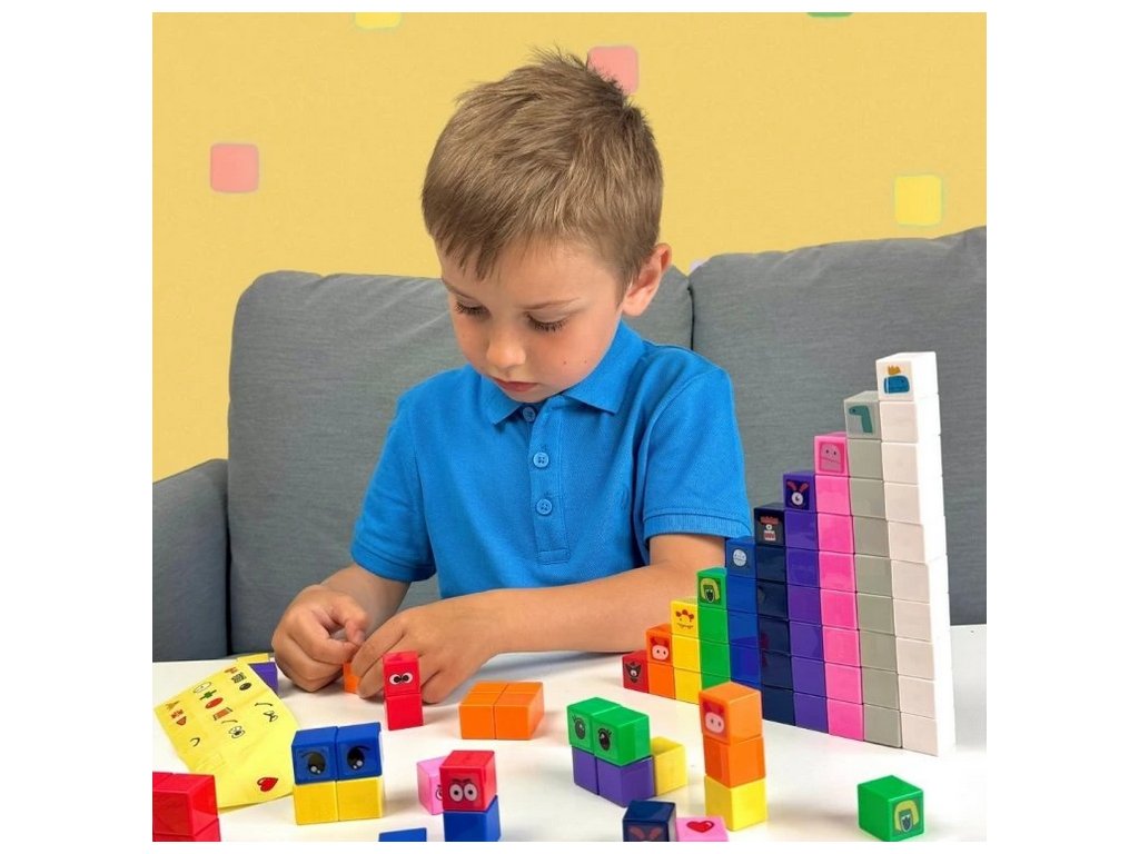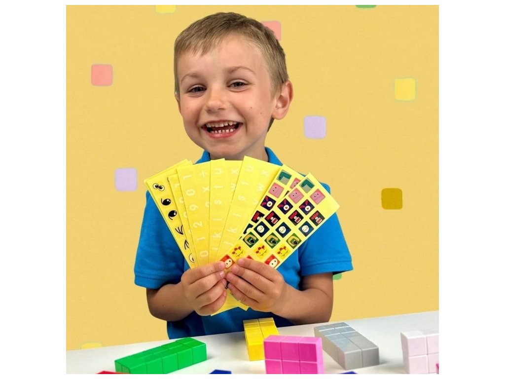 Díky bezpečnému provedení a snadné manipulaci jsou dílky vhodné i pro nejmenší děti – už od 18 měsíců pod dohledem, ideálně od 2–3 let. Samolepky dodávají stavebnici výrazný edukativní rozměr – pomáhají se seznámením s čísly, emocemi a tvary.