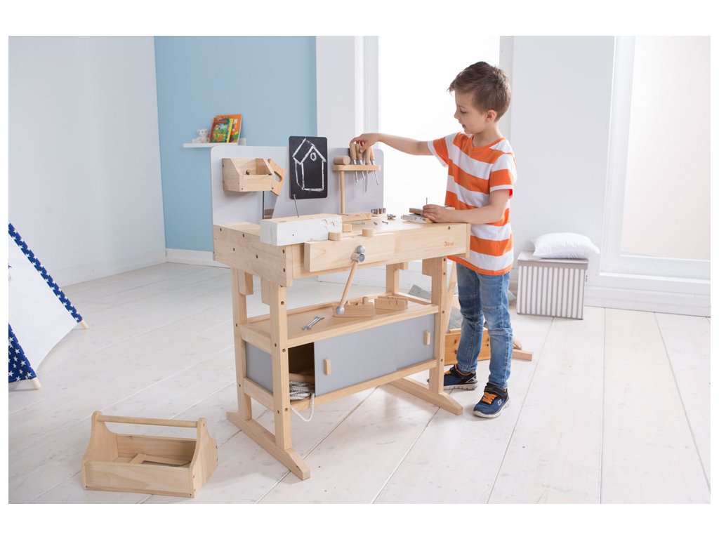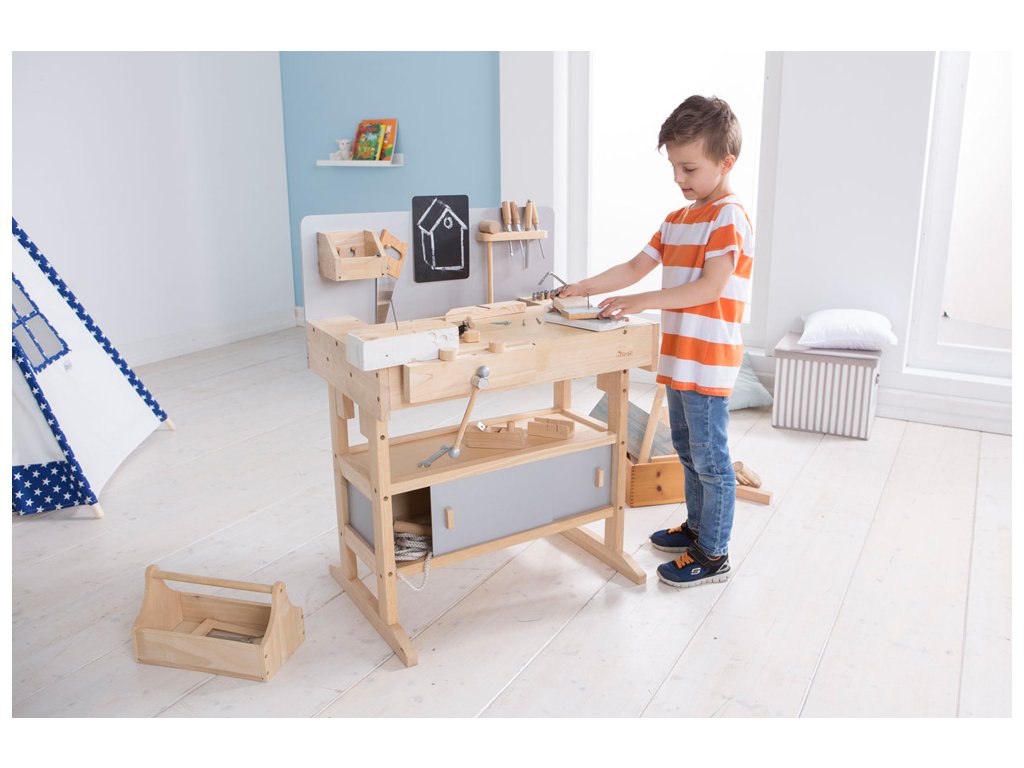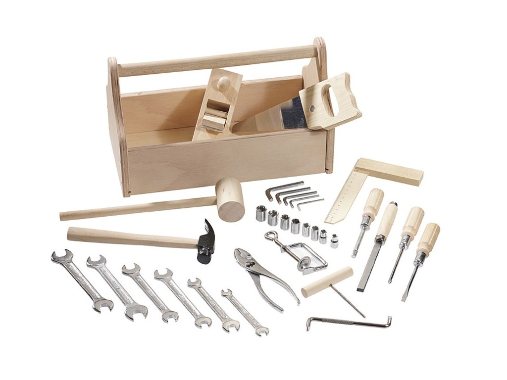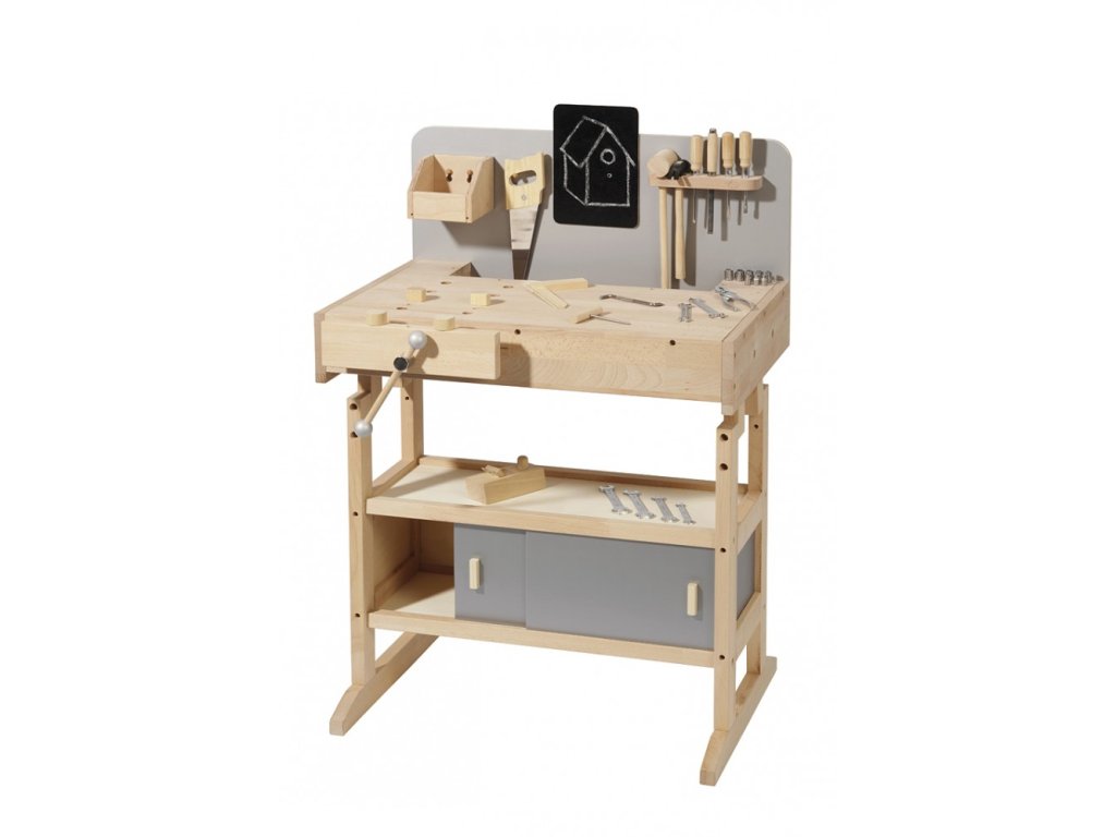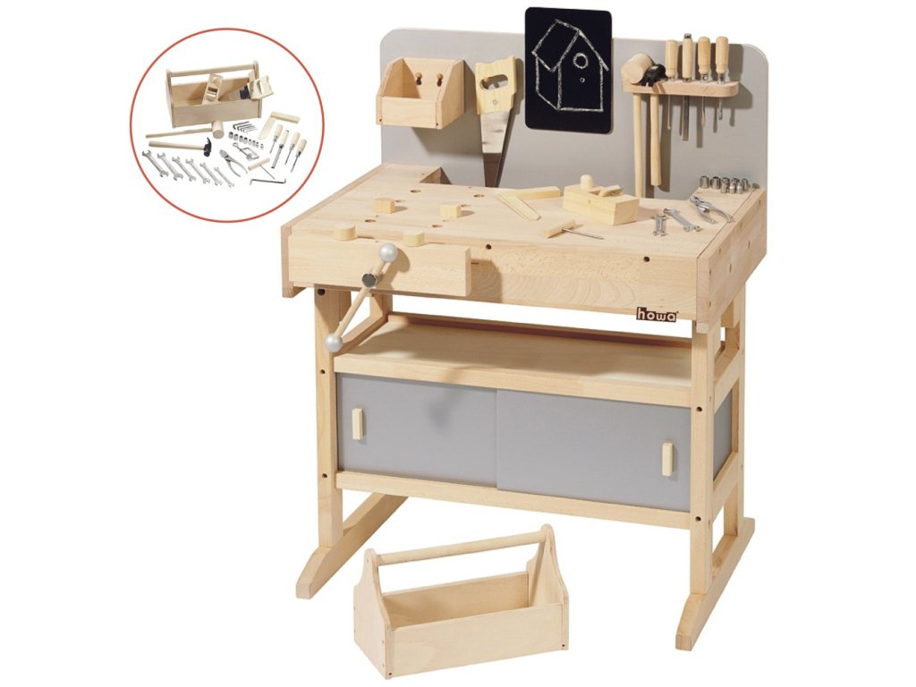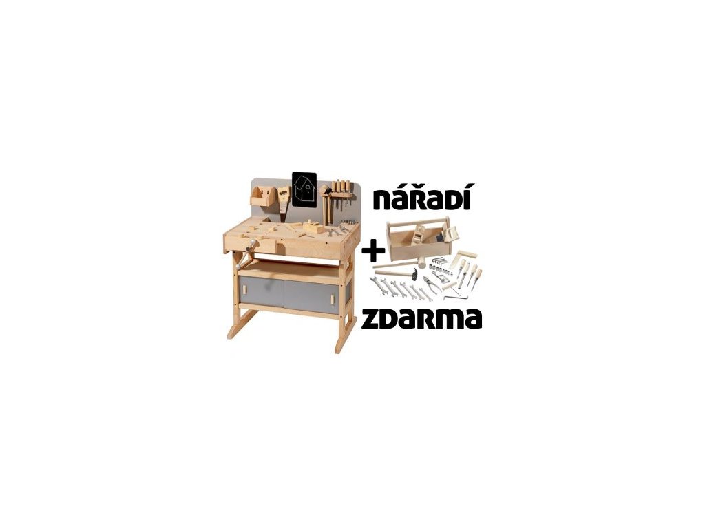 Součástí je tabule, svěrák, úložný prostor a 32ks nářadí v dřevěné bedýnce - nářadí je plně funkční