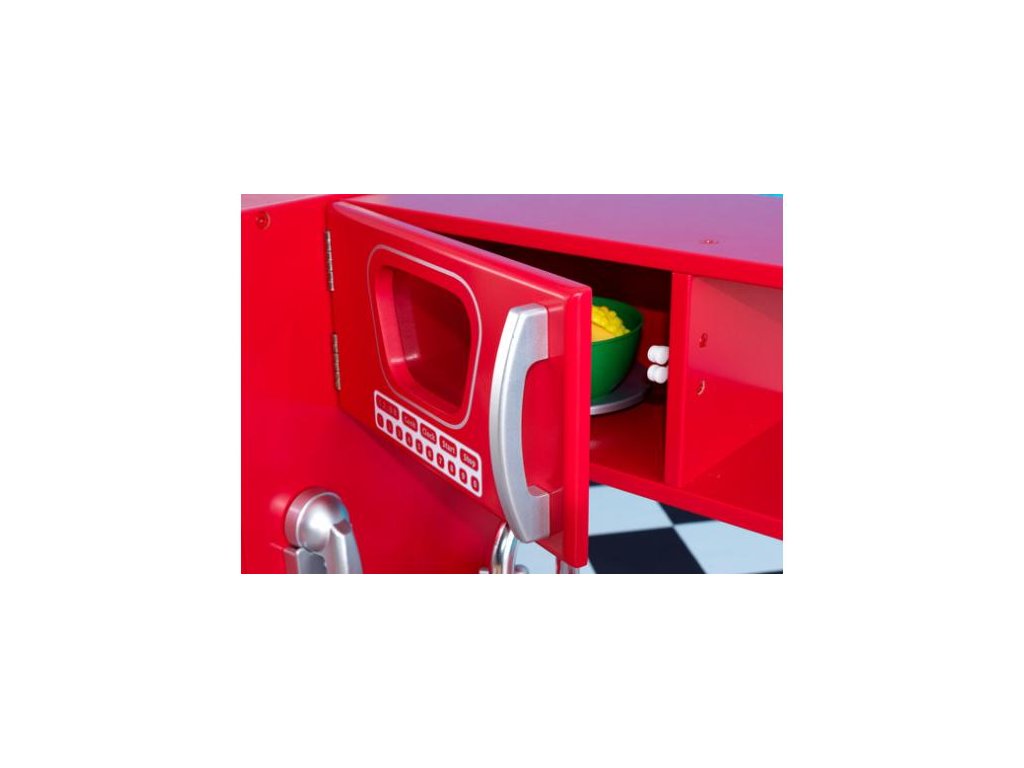 Dětská dřevěná kuchyňka obsahuje dřez, sporák s pečící troubou, mikrovlnou troubu, lednici s mrazničkou a úložnou skříňku