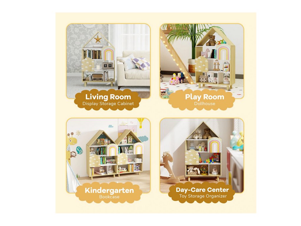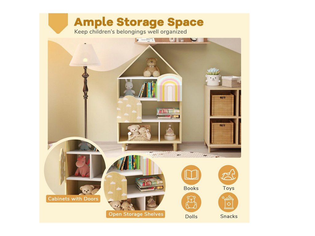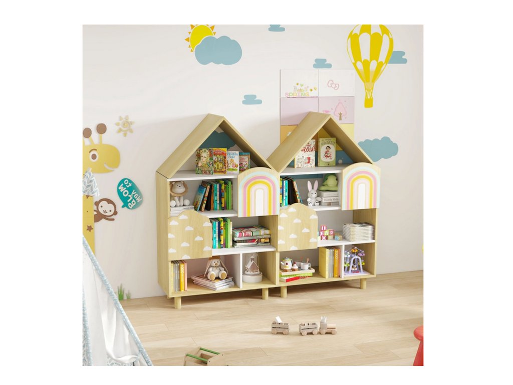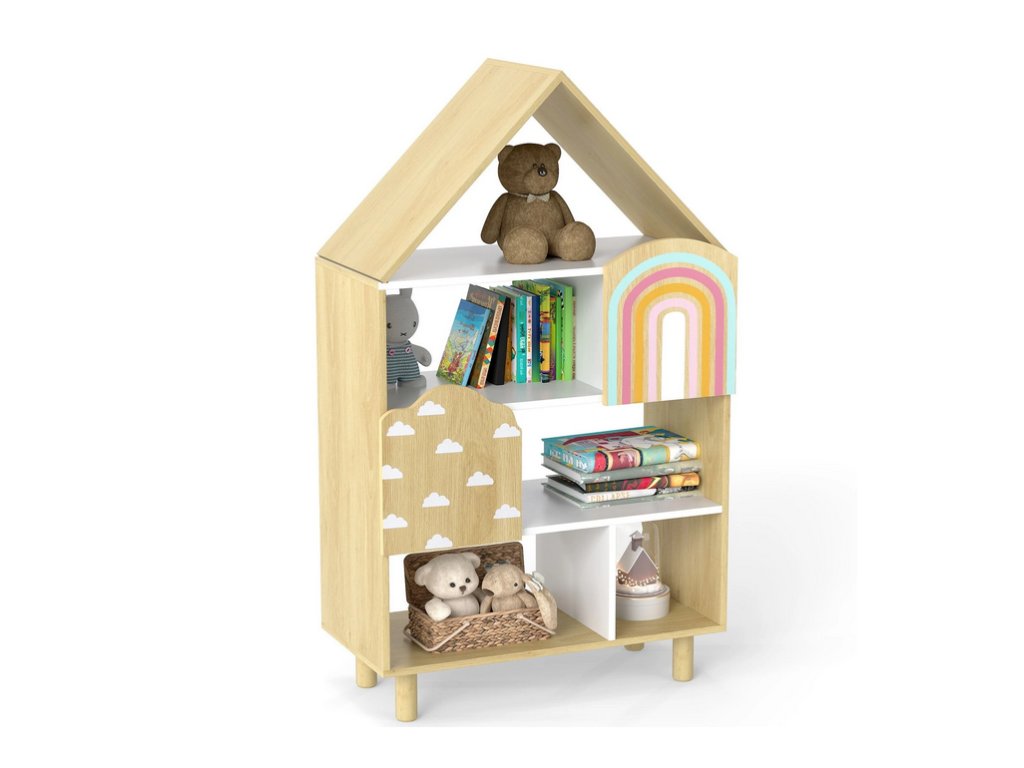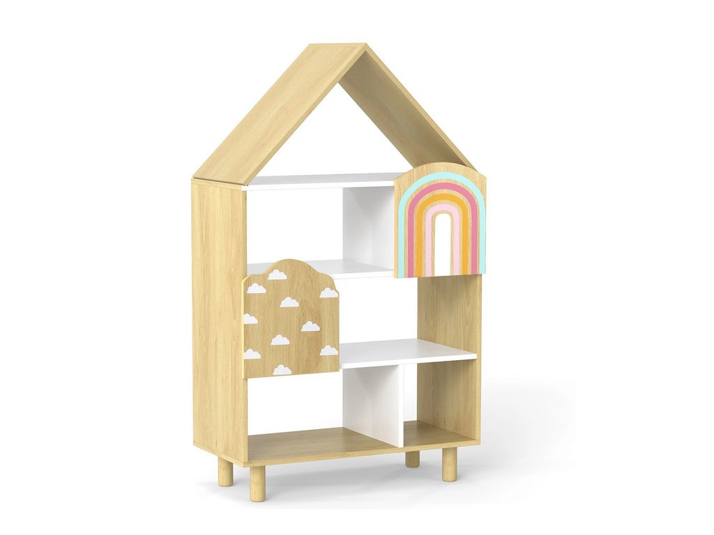 Dětský regál ve tvaru domečku spojuje funkčnost s hravým designem, který okamžitě zútulní každý pokojíček. Čtyři prostorné police nabízí dostatek prostoru pro knihy, plyšáky i drobnosti, zatímco spodní část je vybavena dvěma dvířky, za kterými se snadno schovají hračky nebo věci, které nemají být stále na očích.