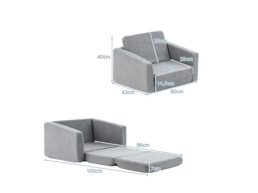 Jednoduchý skládací systém umožní dítěti vybrat si nejpohodlnější variantu a nízká hmotnost mu umožní nosit nábytek bez pomoci. Stabilní opora zad a ramen usnadňuje batoleti osvojení správné polohy při sezení a silná pěnová matrace poskytne pohodlí během spánku, když je rozložená. Pohovka je ideální jako místo na čtení, sledování televize, hraní, jídlo a spánek.
