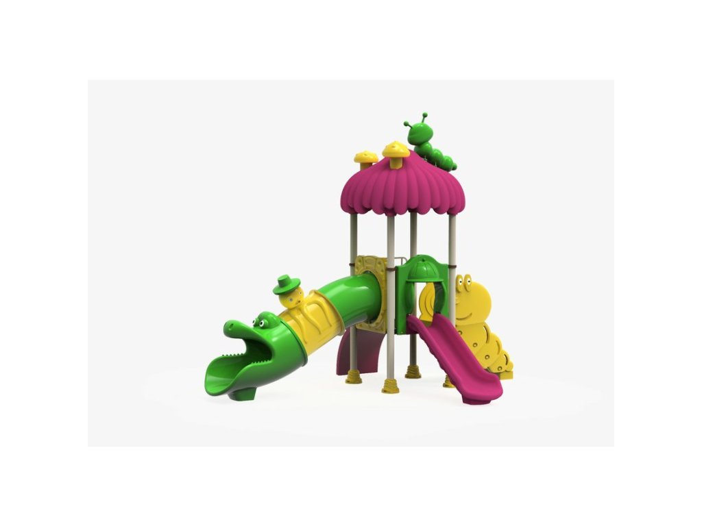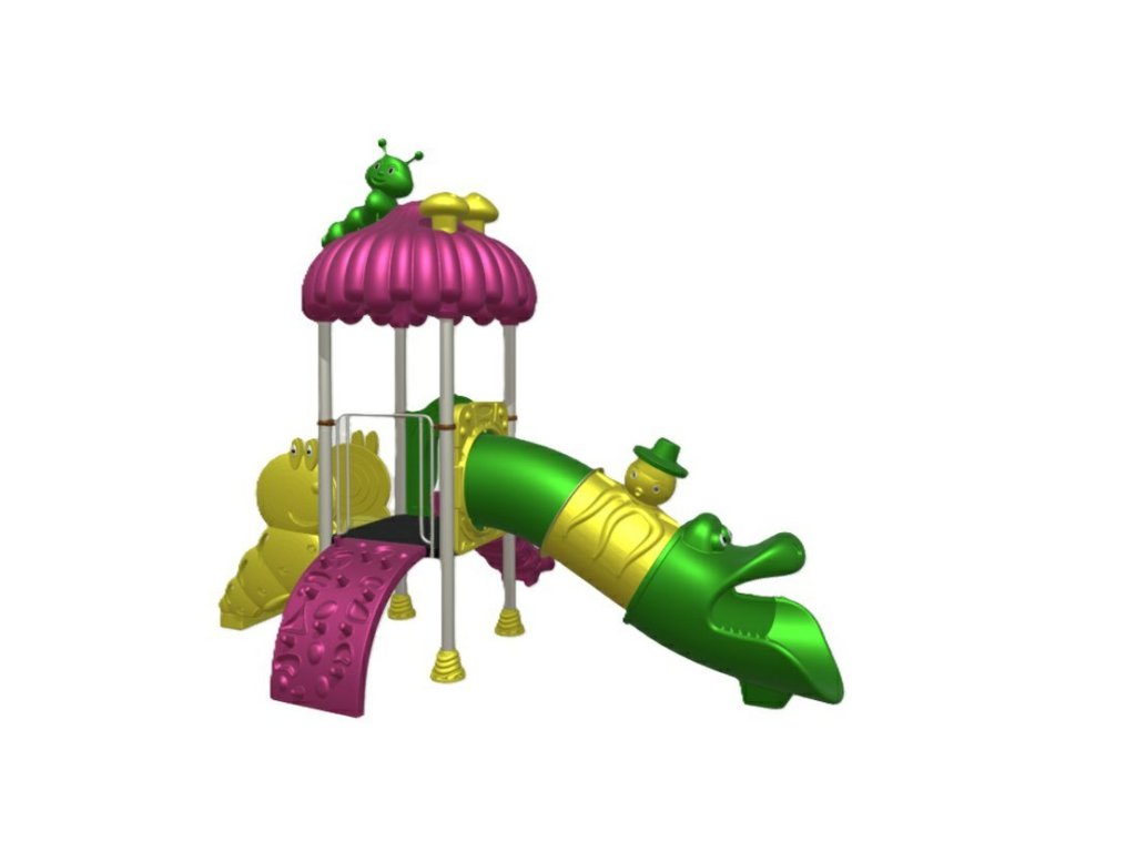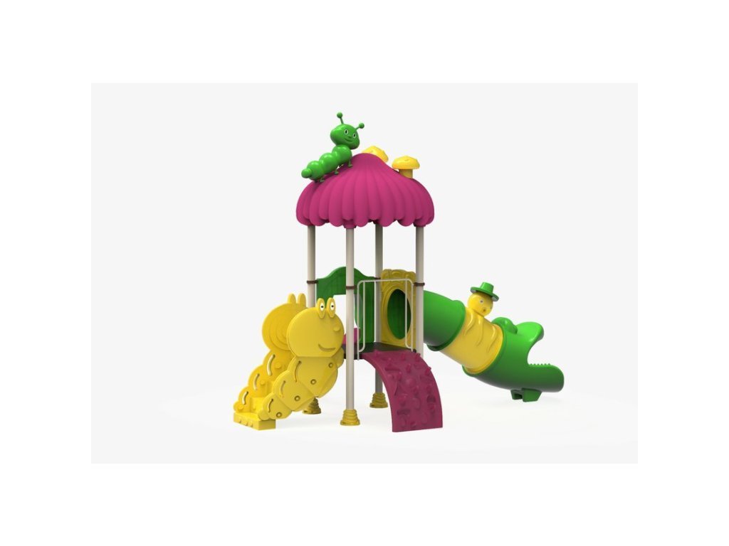 Sestava se skládá z: 1x věže se střechou ve tvaru houby, rovného tobogánu dlouhého 3,4 m ve veselém designu, skluzavky o délce 2 m, na sestavu mohou děti nastupovat po pohodlných schůdcích ve tvaru housenky nebo po prohnuté lezecí stěně.