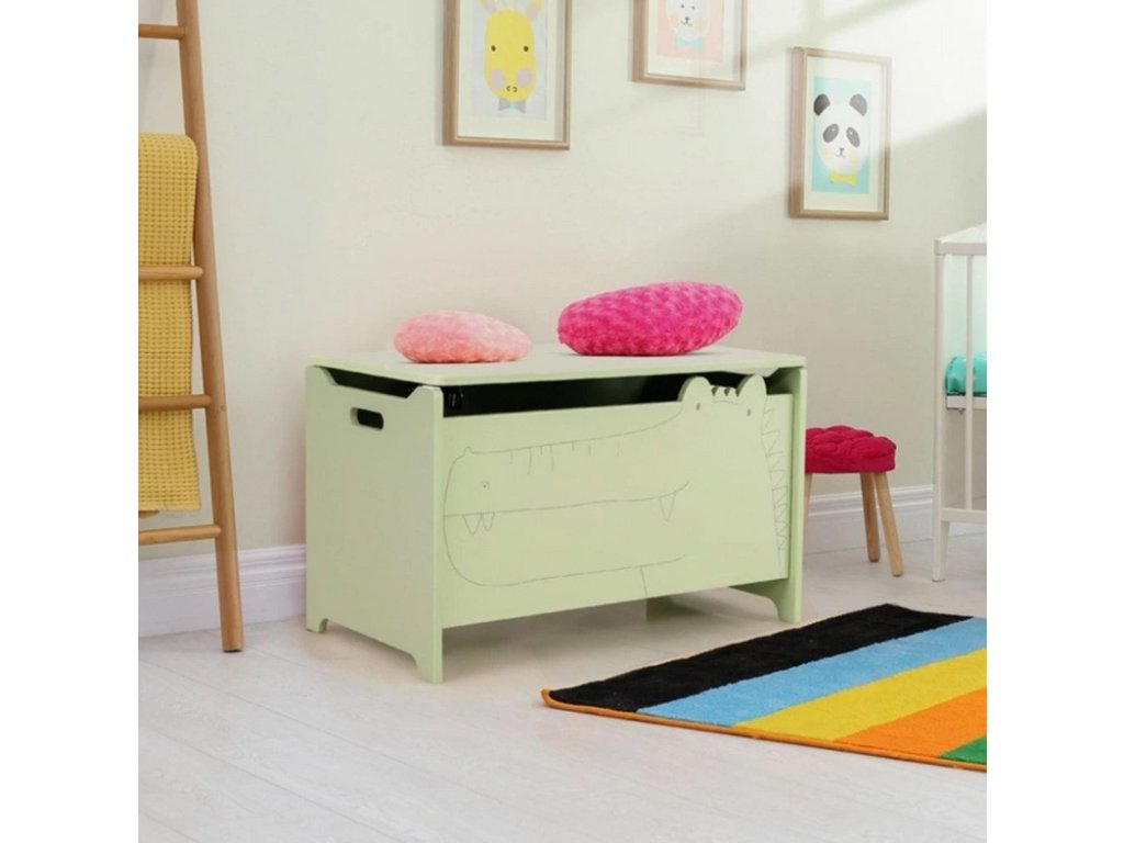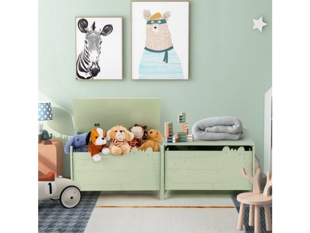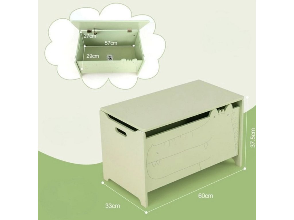 Dětský úložný box na hračky v jemné světle zelené barvě s veselým motivem krokodýla je ideálním řešením pro ukládání hraček, plyšáků, knížek i dalších pokladů vašich nejmenších. Díky svému hravému designu si ho děti okamžitě oblíbí a uklízení pro ně přestane být nudnou povinností. Veselá kresba krokodýla na čelní straně truhly vytváří příjemnou a přátelskou atmosféru, která skvěle zapadne do každého dětského pokoje.