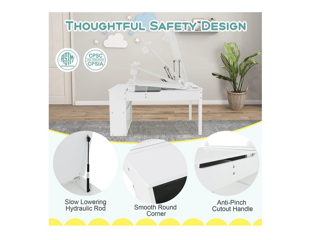 Tento psací stůl je vybaven vyklápěcí tabulí, úložným prostorem a židlemi vše navrženo pro maximální efektivitu.