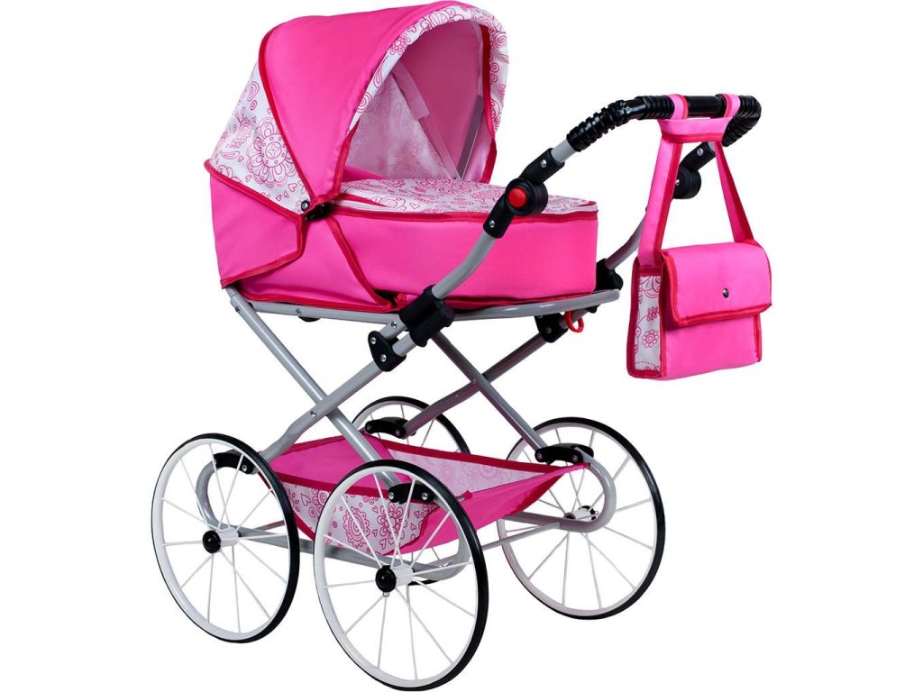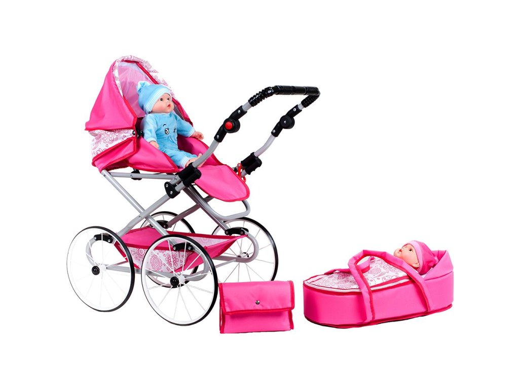 Krásný a jedinečný dětský Retro kočárek 2v1 New Baby Natálka pro malé slečny. Kočárek je velmi kvalitní s kovovou konstrukcí. Hluboký kočárek lze upravit i na sportovní. Korbička je upevněná ve směru jízdy a lze ji použít na přenášení panenky. korbička má zapínání na zip. Kočárek má nastavitelnou rukojeť. Součástí je i taška na drobnosti v barvě kočárku a velký nákupní košík. Moderní a lehký kočárek pro panenky s klasickou odpruženou konstrukcí v pestrých barvách. Kočárek má pojistku proti samovolnému složení. Vyrobeno v EU.