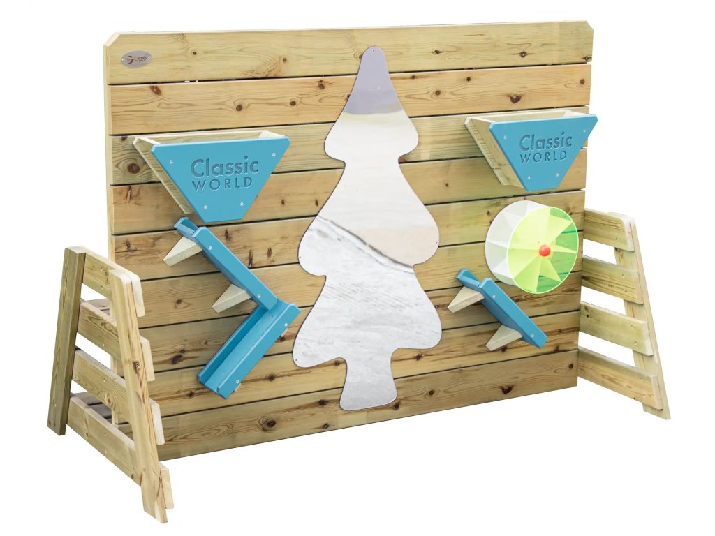 Tuto dřevěnou hrací stěnu na písek si oblíbí všechny děti, které si rády hrají s pískem. Písek nasypou do nálevky a mohou pozorovat, jak se začne sypat po dřevěných lopatkách nebo jak roztočí svou vahou kolo. Akrylové zrcadlo uprostřed přidá ještě více zábavy do dětských her. Zábavnou a originální formou děti porozumí charakteristikám písku a zároveň rozvíjí svou fantazii, kreativitu a schopnosti využívat manuální dovednosti.