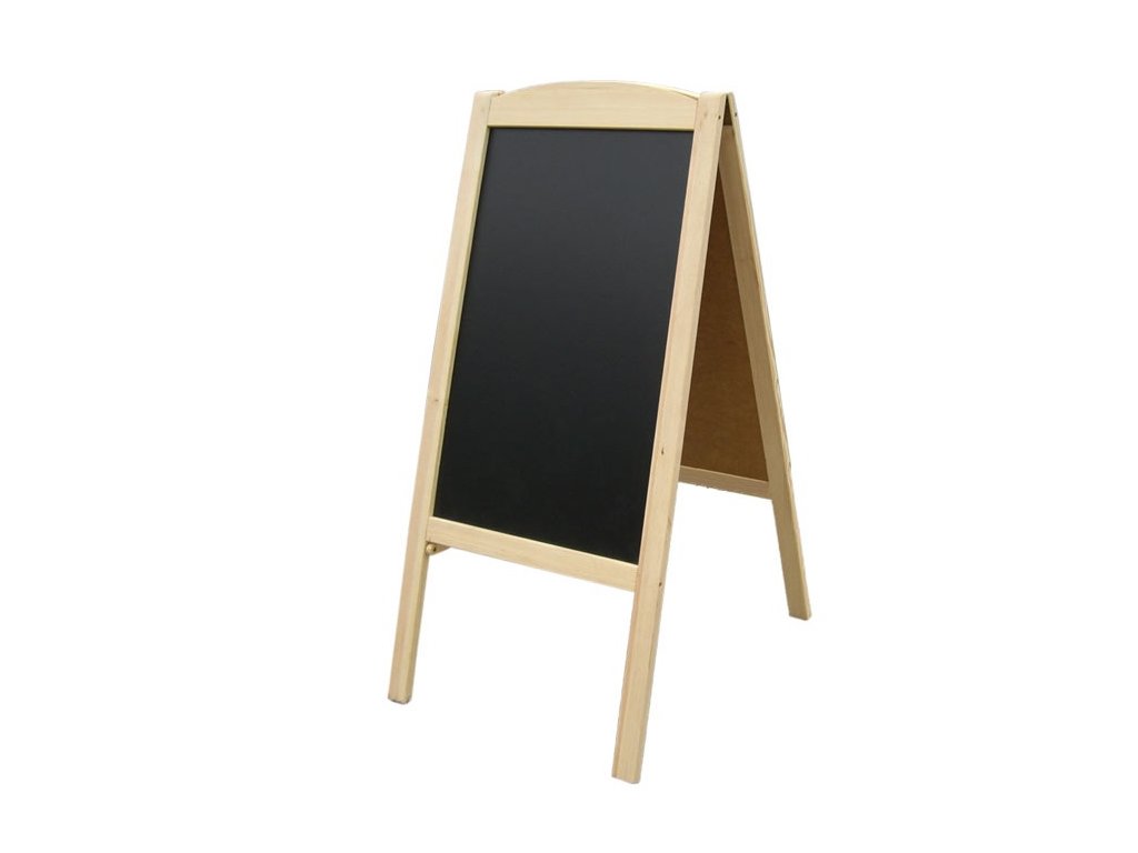 Masivní dřevěný reklamní stojan, z obou stran je černá tabule pro psaní křídou.