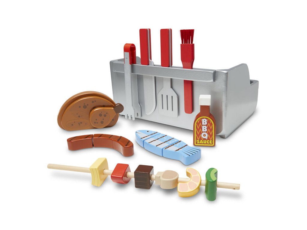 25dílná sada obsahuje speciality na grilování, jako je celé kuře na grilu, které se točí na jehle, celá ryba, klobása, krevety a dokonce zelenina na grilování .