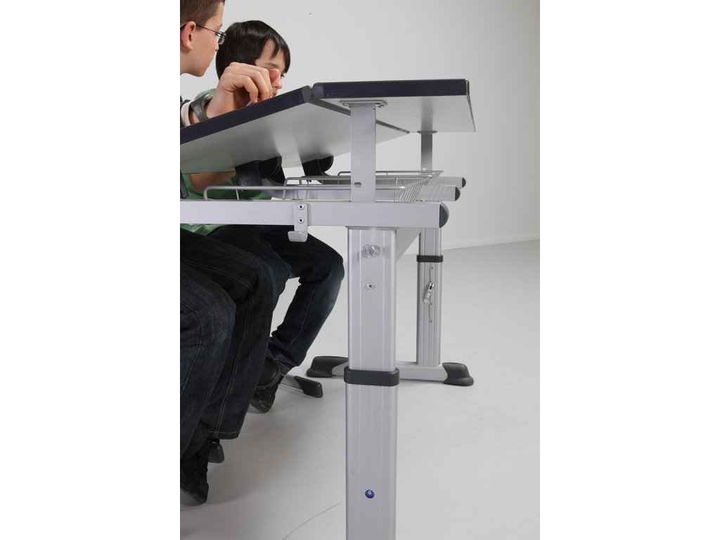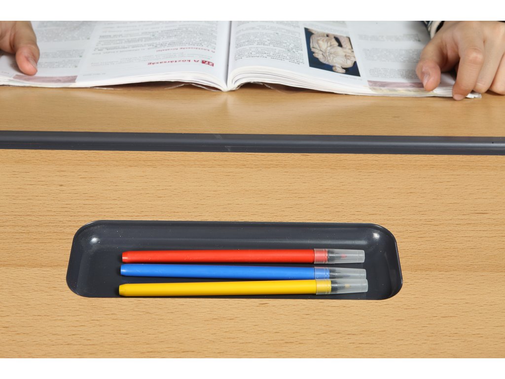 Hliníková konstrukce, deska stolu buk, tl. 18 mm, drážka na tužku.