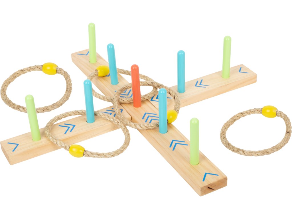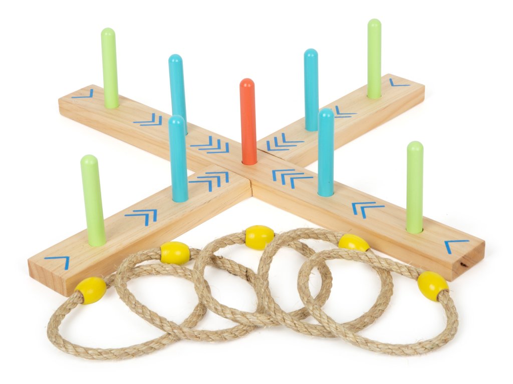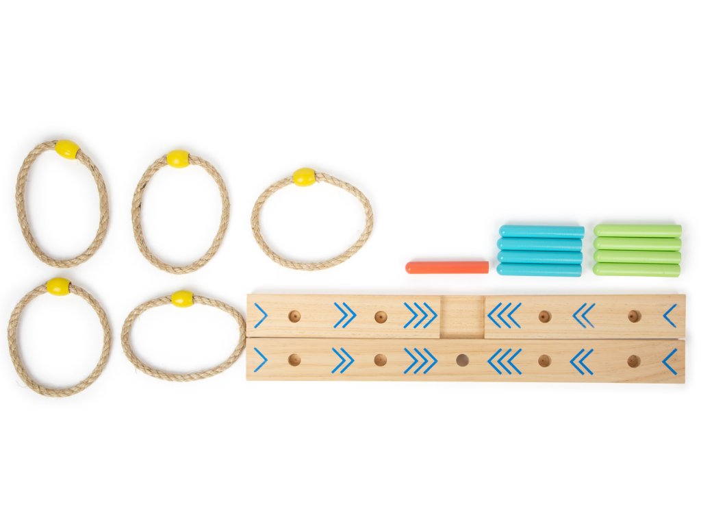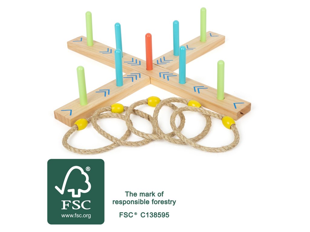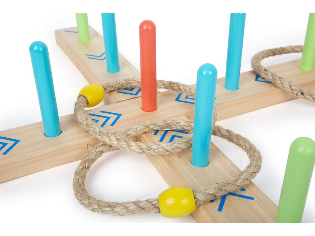 Kdo má nejlepší mušku? V této hře házení krůhu musíte trefit pletené kroužky na 9 kolíků dřevěné základny. Skóre vypočítáte podle barevných šipek, body tak spočítají i děti, které ještě neumí poznávat čísla. Hru lze jednoduše složit a zase rozložit, můžete ji skladovat v bavlněném pytlíku s poutkem, v kterém je od výroby zabalena. Perfektní hra, s kterou si děti užijí mnoho hodin zábavy. Trénuje koordinaci ruka-oko a zručnost. Základna je vyrobena ze 100% certifikovaného FSC® dřeva.