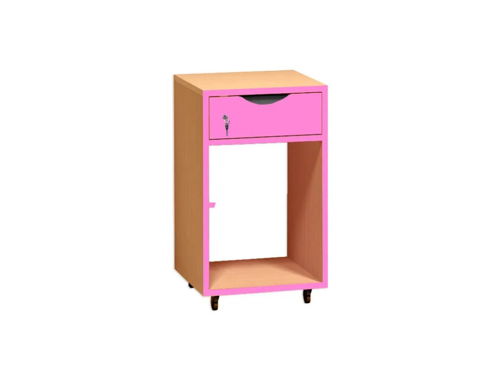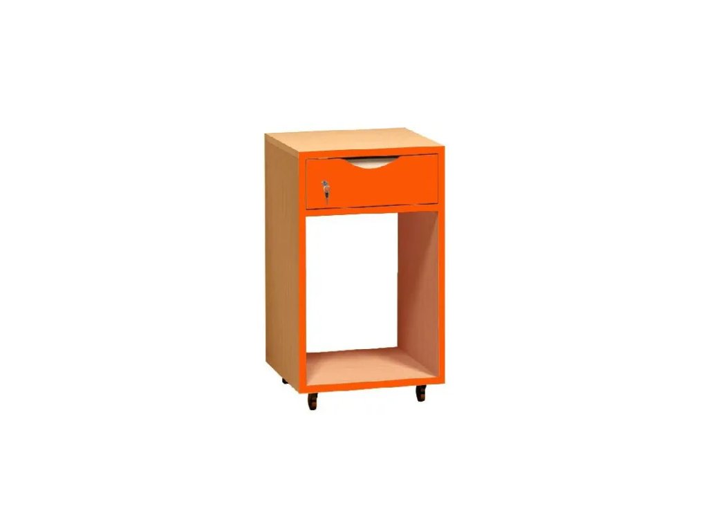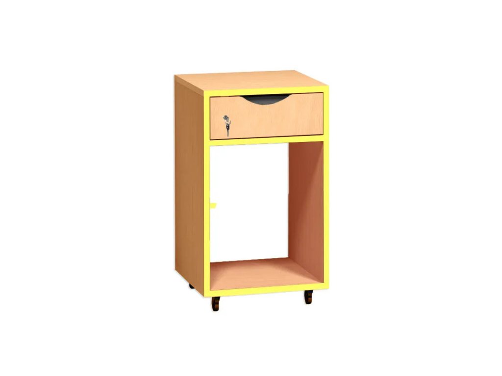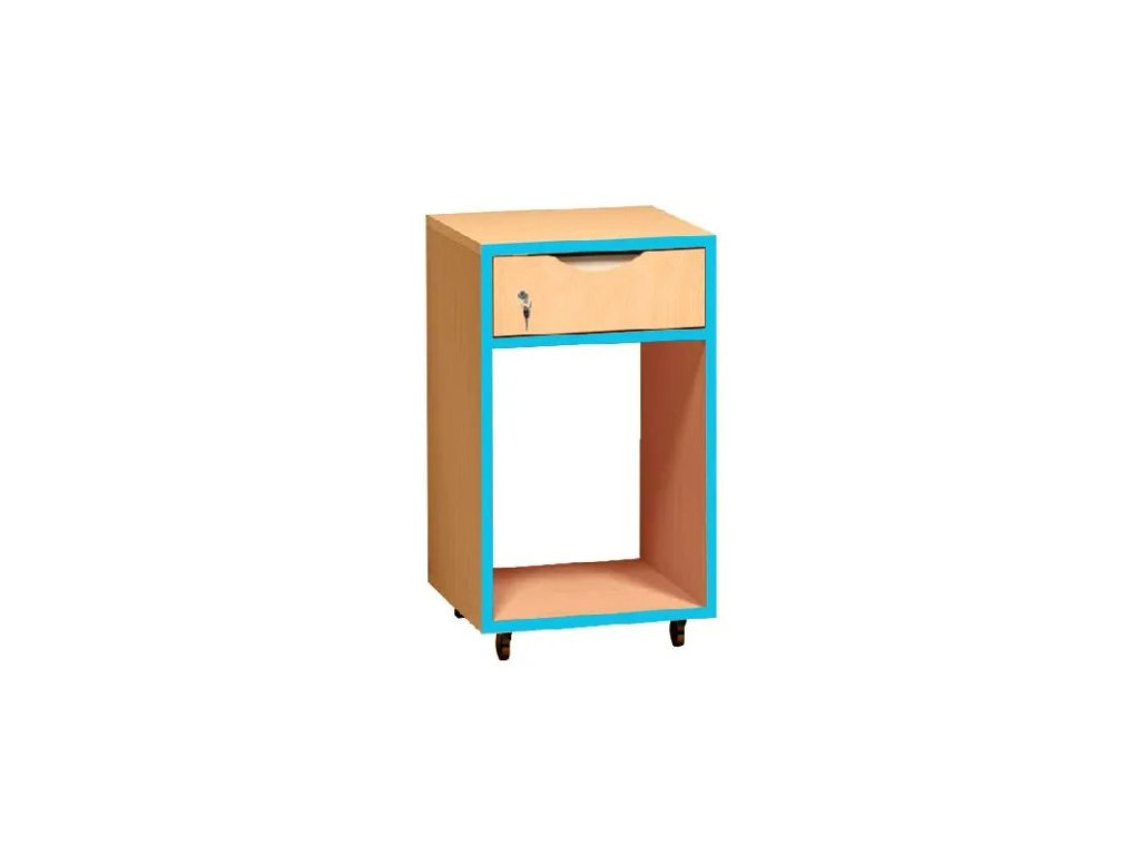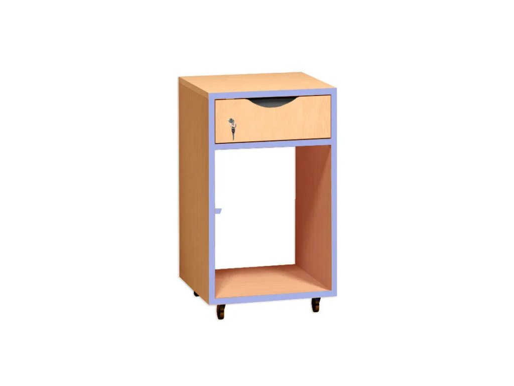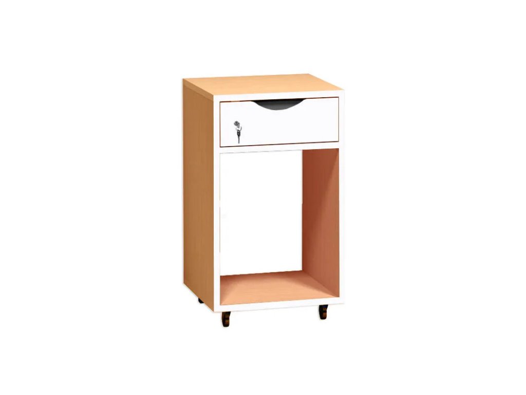 Pojízdný kontejner s policí pro PC a zásuvkou, která je opatřena zámkem.