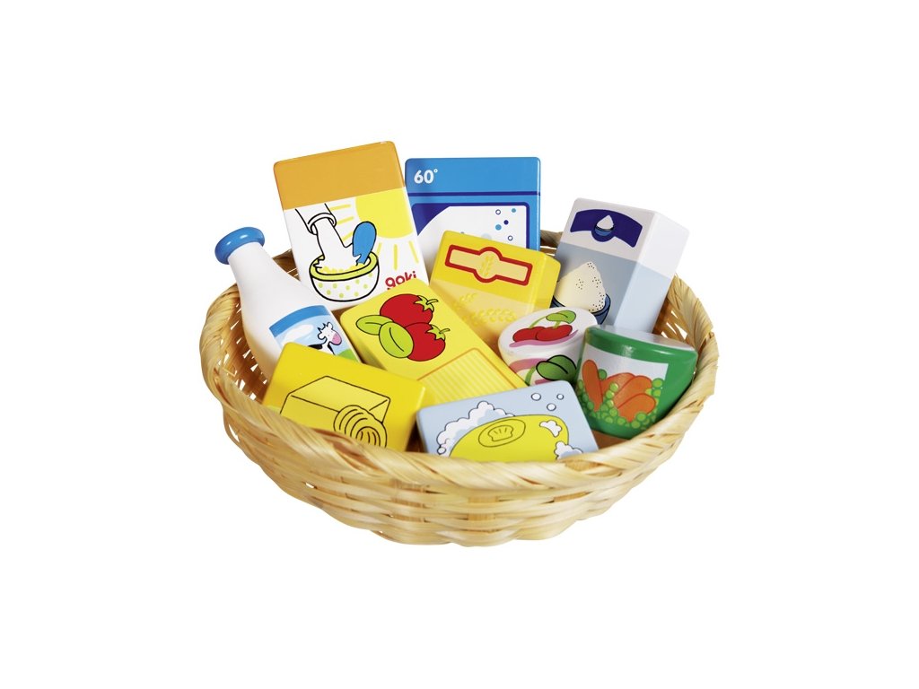 Praktické potřeby do domácnosti obsahuje set v proutěném košíku. Děti v něm najdou mléko, máslo, cukr, mouku, prášek do pečiva, prášek na praní, mýdlo, plechovku s hráškem a mrkví, marmeládu a kompot.