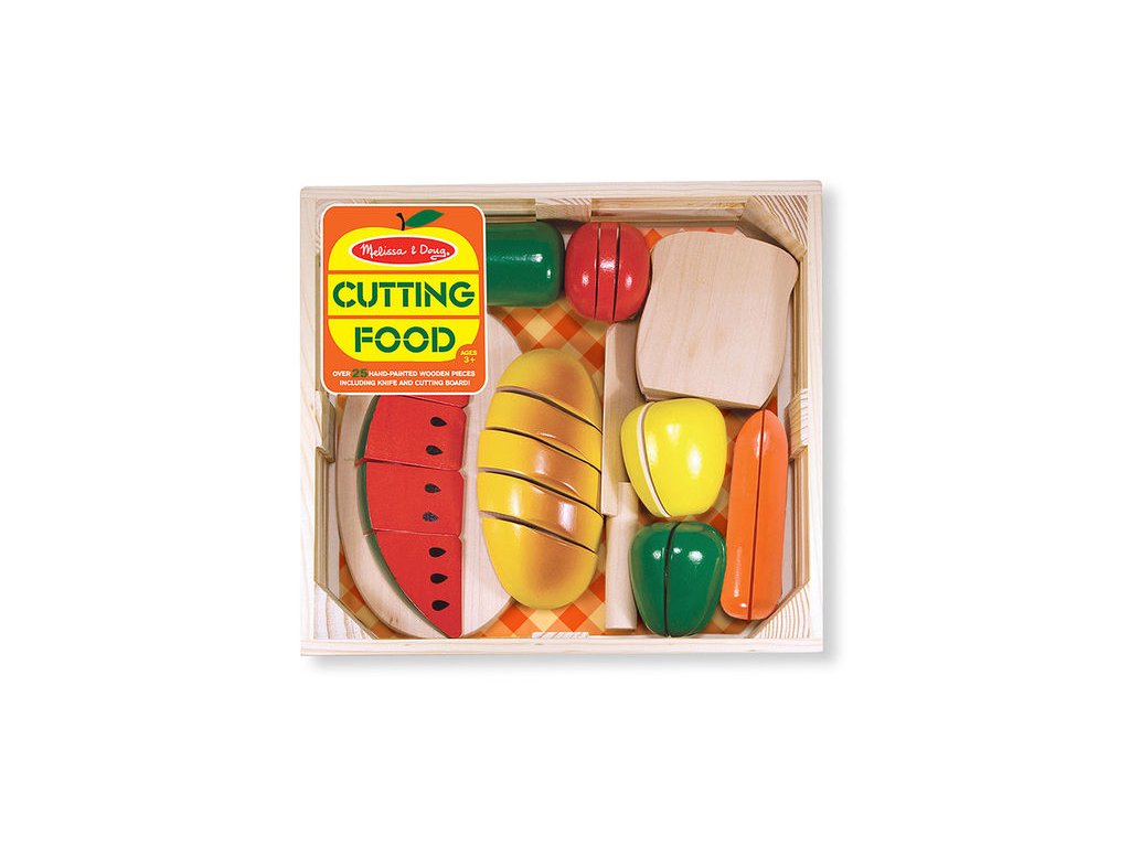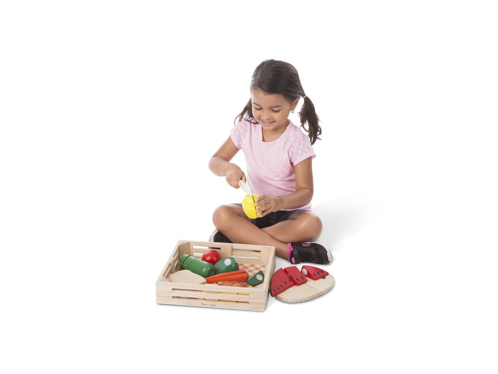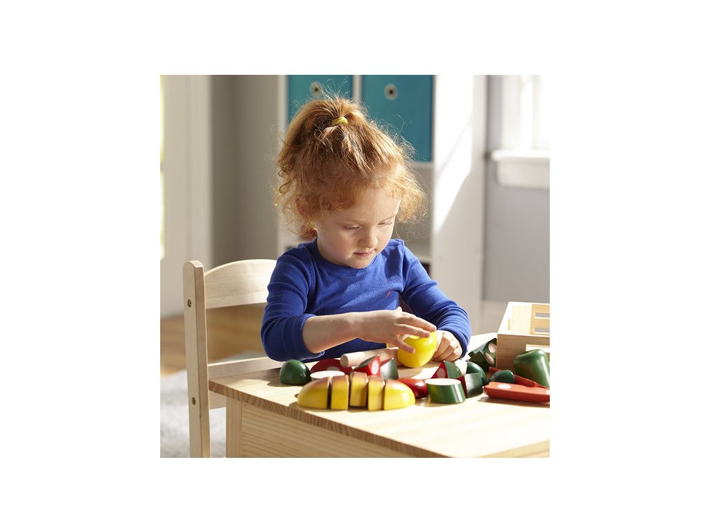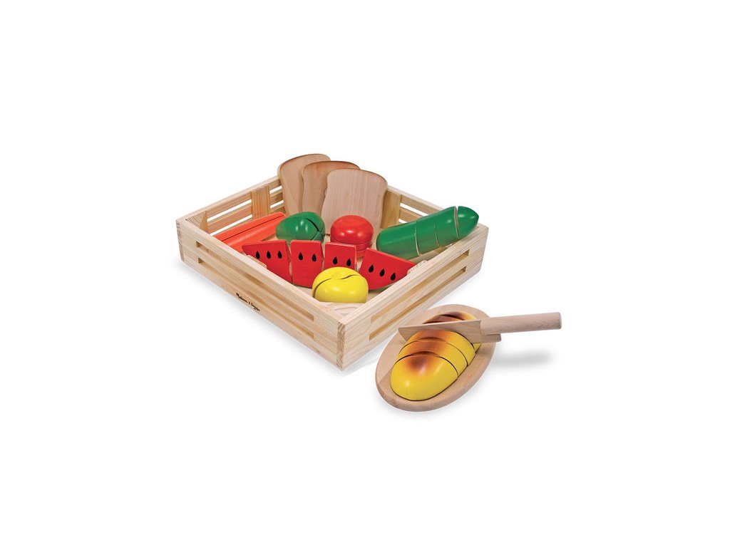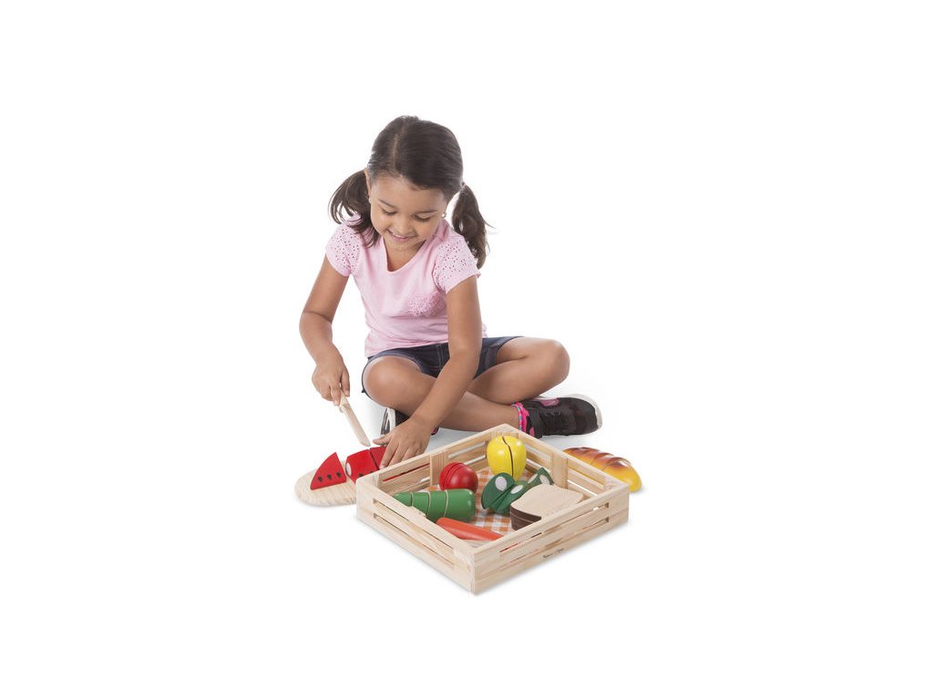 Obsahuje: 8 kusů /31 dílků/ dřevěných napodobenin potravin, prkénko a dřevěný nůž, uskladněno v praktické dřevěné bedýnce.