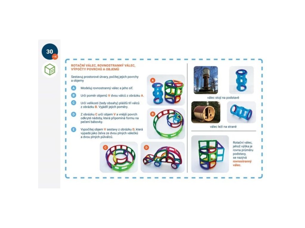 Součástí boxu je sada výukových karet s metodickými pokyny pro děti i rodiče (soubor 33 karet s úkoly). Některé karty jsou oboustranné, kdy na rubové straně najdete obsáhlejší řešení vč. názorných obrázků. K většině úkolů najdete řešení na posledních 2 kartách. Projekt je opět realizován ve spolupráci s akreditovanou lektorkou vzdělávání učitelů, RNDr. Marií Kupčákovou, Ph.D. Výukové karty 2D a 3D geometrie je materiál určený pro přímou podporu učitelů ZŠ nebo rodičů. Jejich obsah koresponduje se současnými požadavky kladenými na žáky českých škol na konci 7. a 9. ročníku ZŠ.