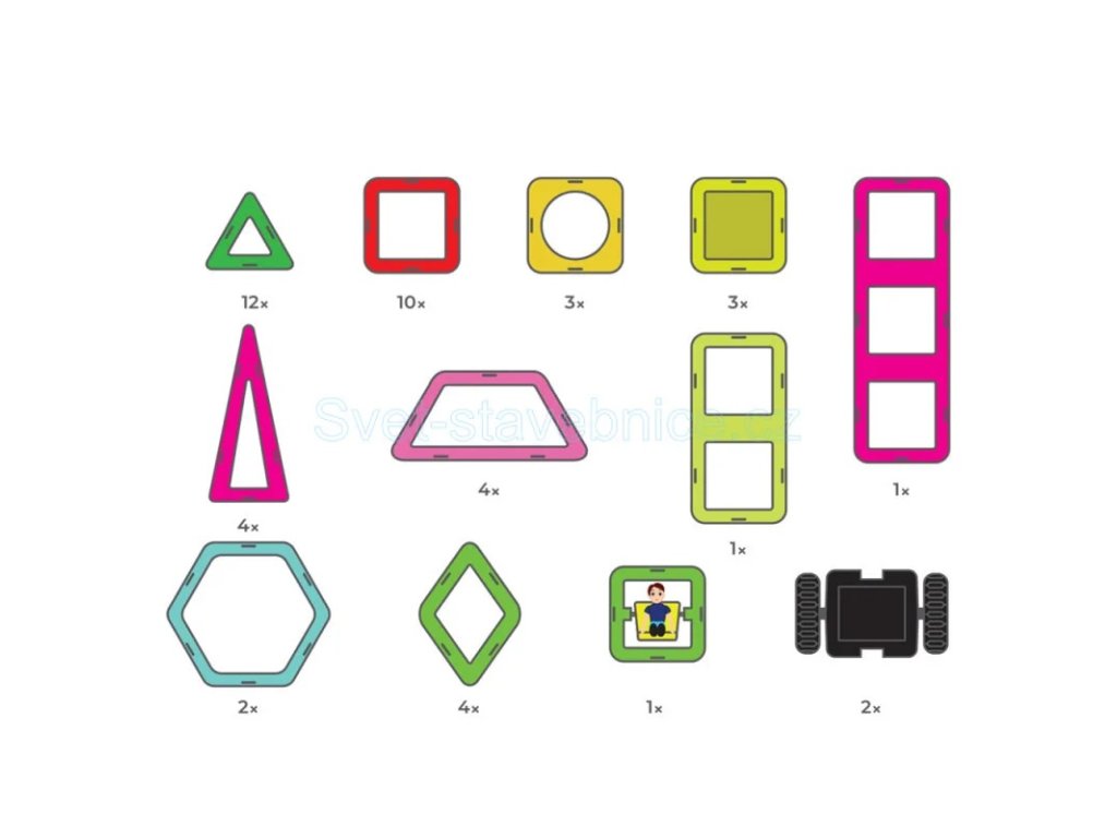 Magnetická stavebnice Magformers Universal Box obsahuje celkem 47 dílků v různých barvách:
