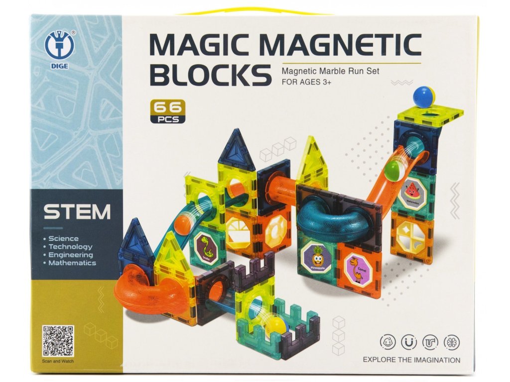 Magnetická stavebnice bloky a dráha. Zábavná hra s magnety, pomocí kterých vytváříte kreativní tvary a dráhu pro své kuličky. Po dostavení své trasy Vás čeká chvíli napětí! Projedou plastové kuličky od začátku do konce? Stavebnice zlepšuje představivost a kreativní myšlení dítěte.