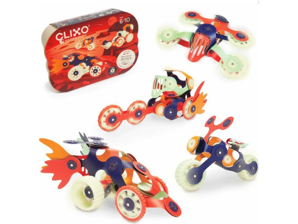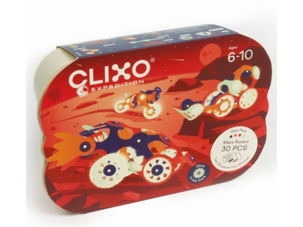 CLIXO Mars Rovers je flexibilní, velmi lehká, ve tmě svítící magnetická stavebnice ve 4 barevných kombinací, která je inspirována origami a zároveň je to skvělá Montessori hračka. Tato stavebnice je založena na principu spojování různých tvarů a dílků přichycením červených a modrých magnetů k sobě. Těchto 30 kusů ve 12 unikátních CLIXO tvarech umožní stavění kreativních konstrukcí a dokáže zabavit téměř každého. Výhodou je, že pro stavění není třeba žádná pevná podložka. Výrobek je zpracován z kvalitního syntetického papíru, kterému neublíží ani voda. Jednoduché balení obsahuje i návrhy na stavění. Stavebnice je díky magnetům velmi dobře skladná a dá se snadno čistit.