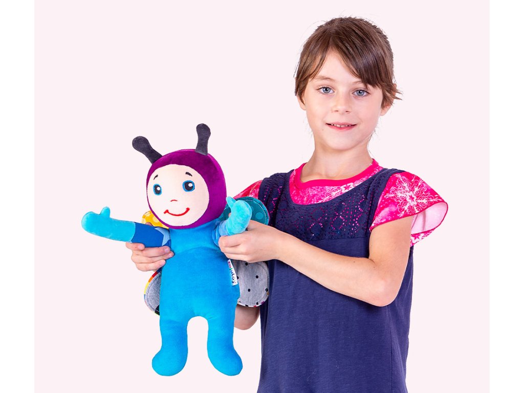 Obličej je vyšitý. V uších je šustivý materiál. Uši vydávají při muchlání šustivé zvuky a ty zaujmou především nejmladší děti.