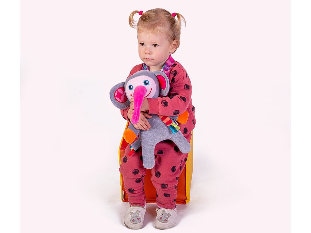 Obličej je vyšitý. V uších je šustivý materiál. Uši vydávají při muchlání šustivé zvuky a ty zaujmou především nejmladší děti.