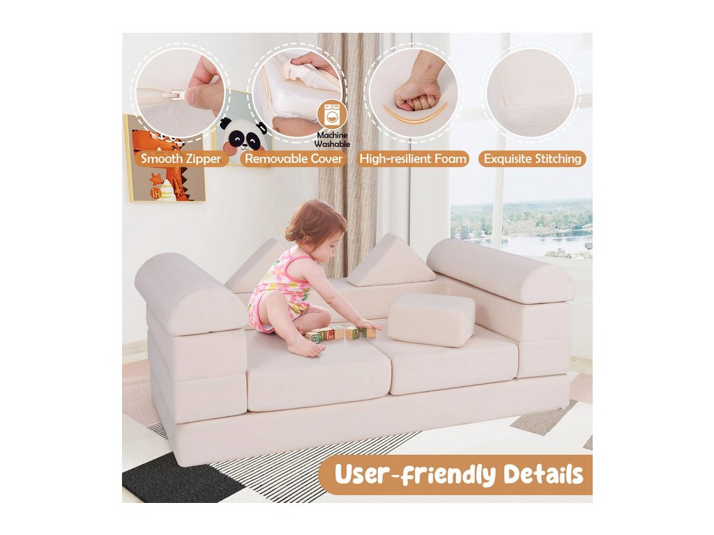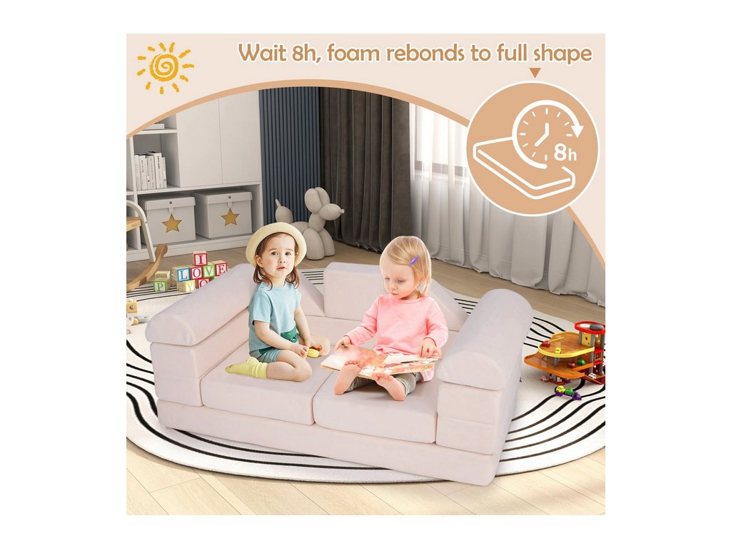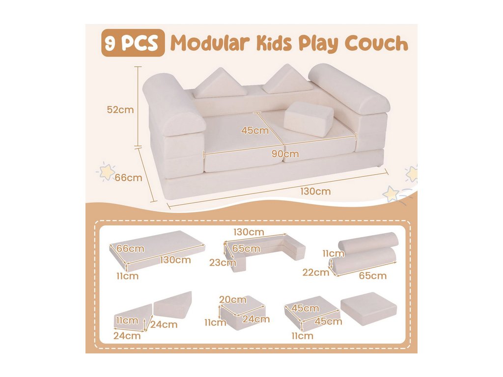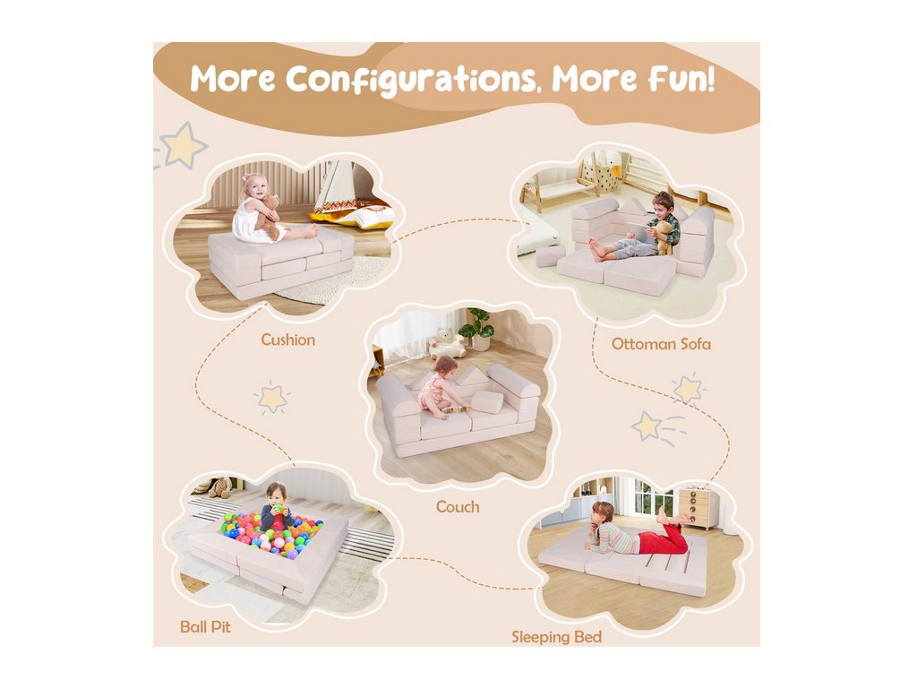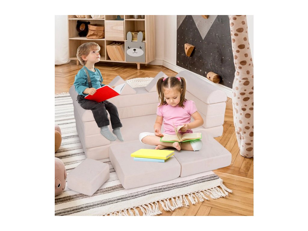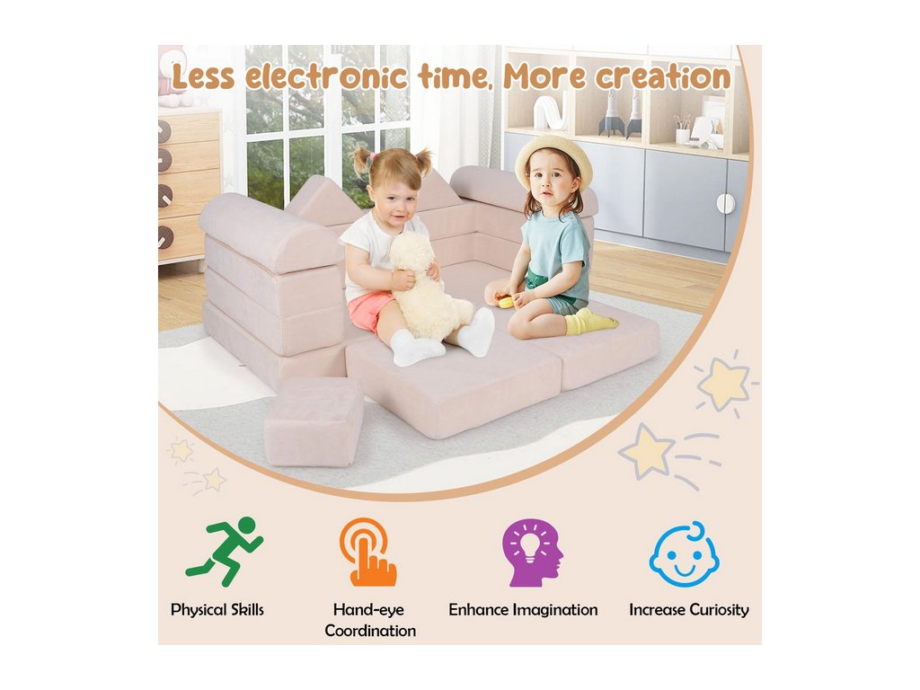 Tento modulární dětský gauč je dokonalou kombinací pohodlného nábytku a zábavné stavebnice, která podporuje dětskou kreativitu, pohyb a hru.