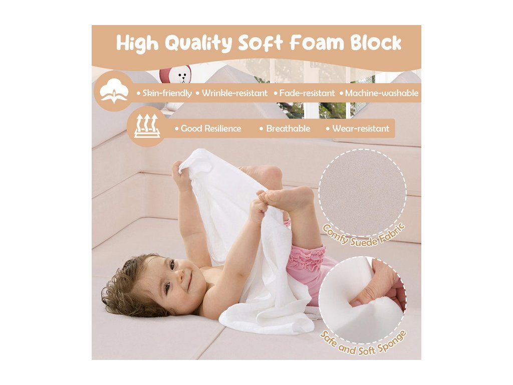 Díky chytrému designu z několika měkkých, ale pevných dílů mohou děti snadno vytvářet nejrůznější tvary, stavby a herní prostředí podle vlastní fantazie – od domečků a tunelů až po stolečky nebo prolézačky.