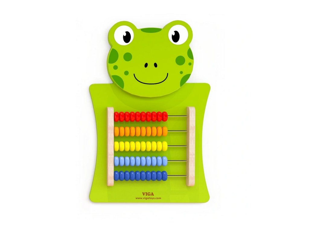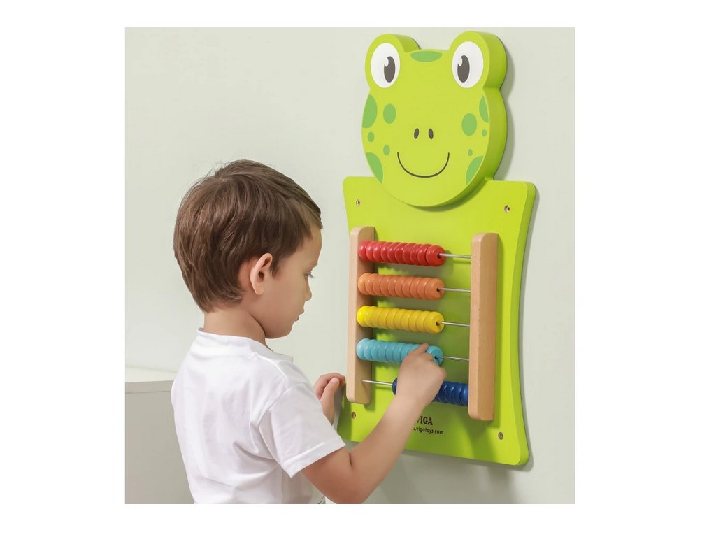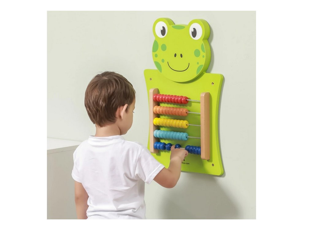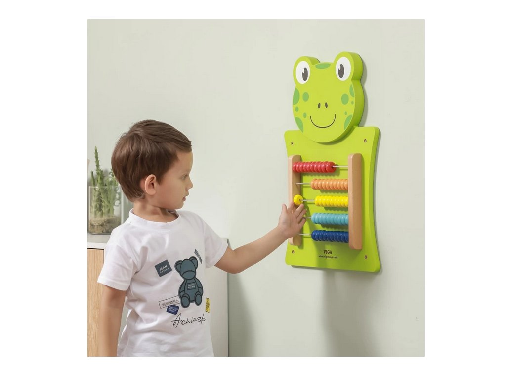 Motorická activity board deska pro děti s tváří milé žabky pomůže dětem s počítáním.
