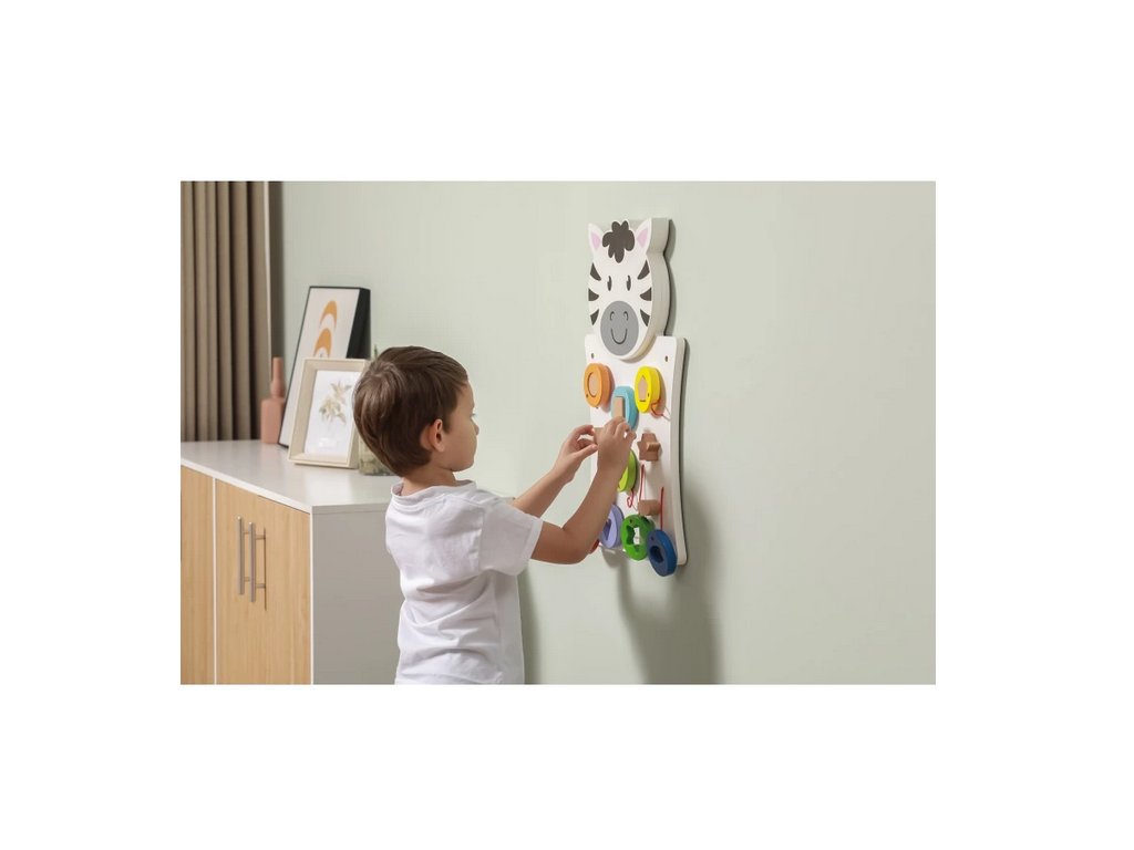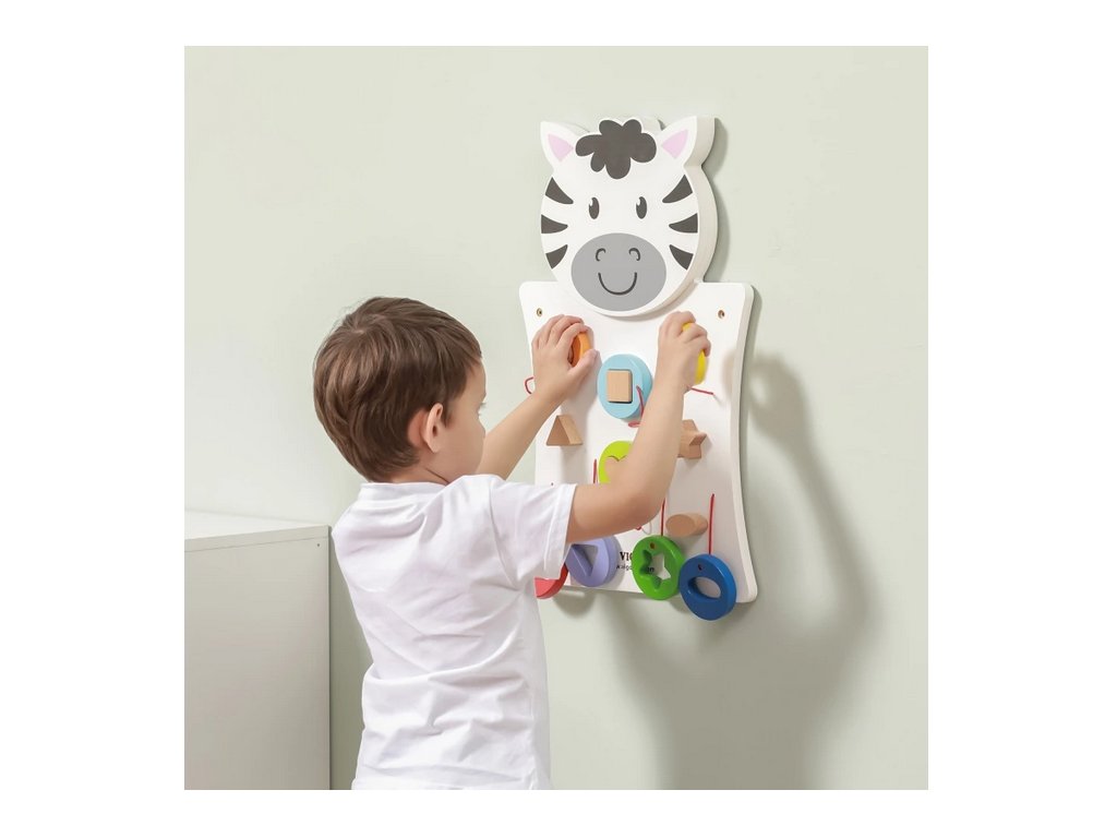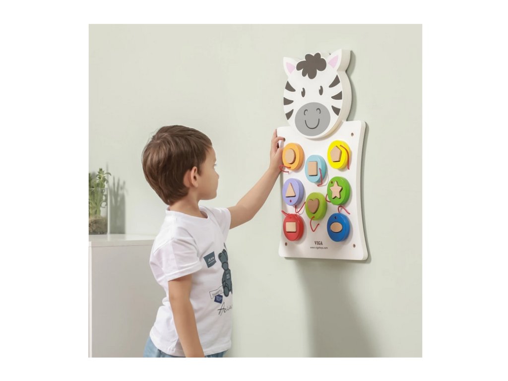 Motorická activity board deska pro děti s tváří milé zebry pomůže dětem s poznáváním jednotlivých tvarů i barev.