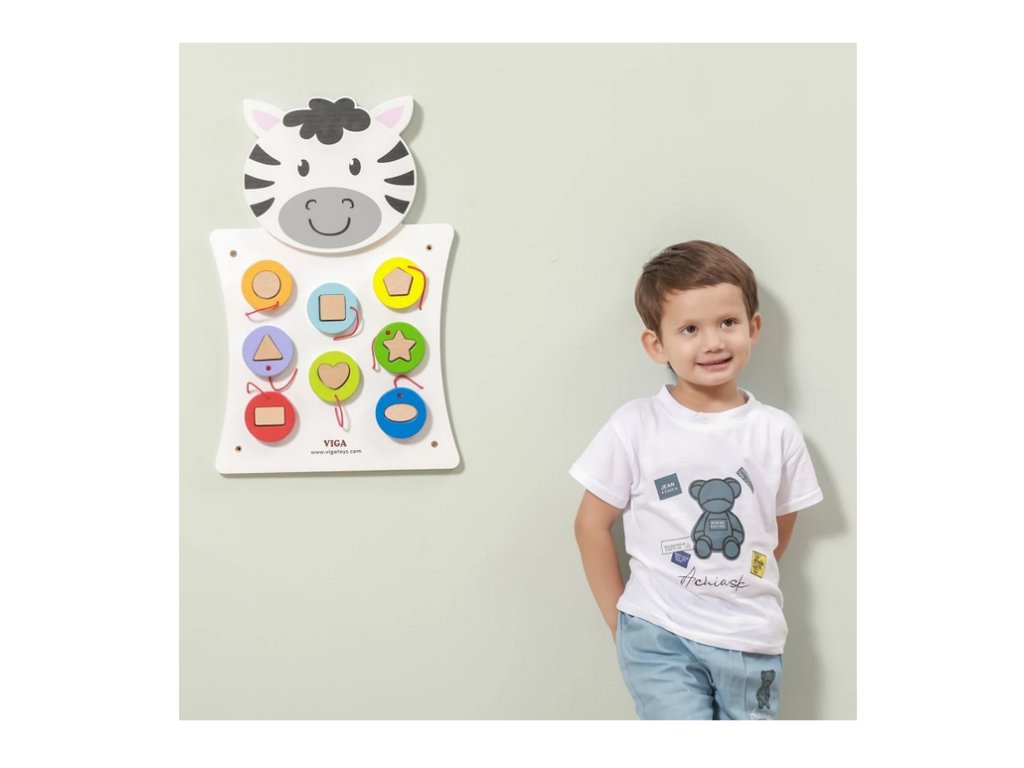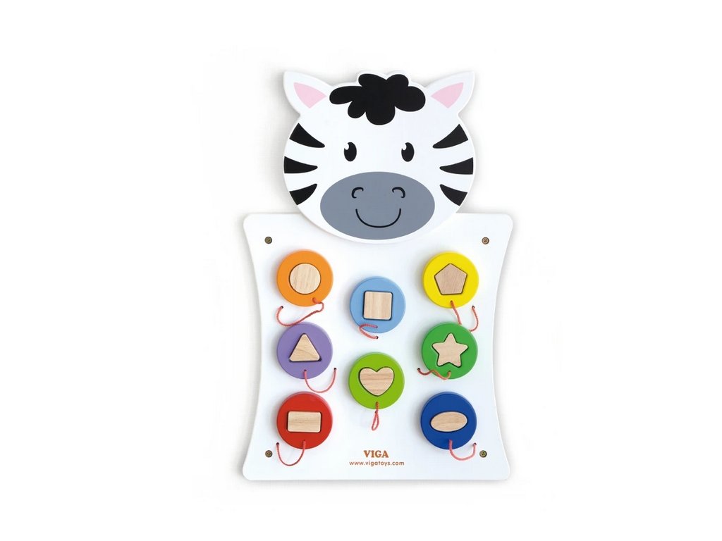 Aktivity board deska v podobě zebry je vybavena dřevěnými vkládačkami, na které je třeba umístit správný tvar na provázku.