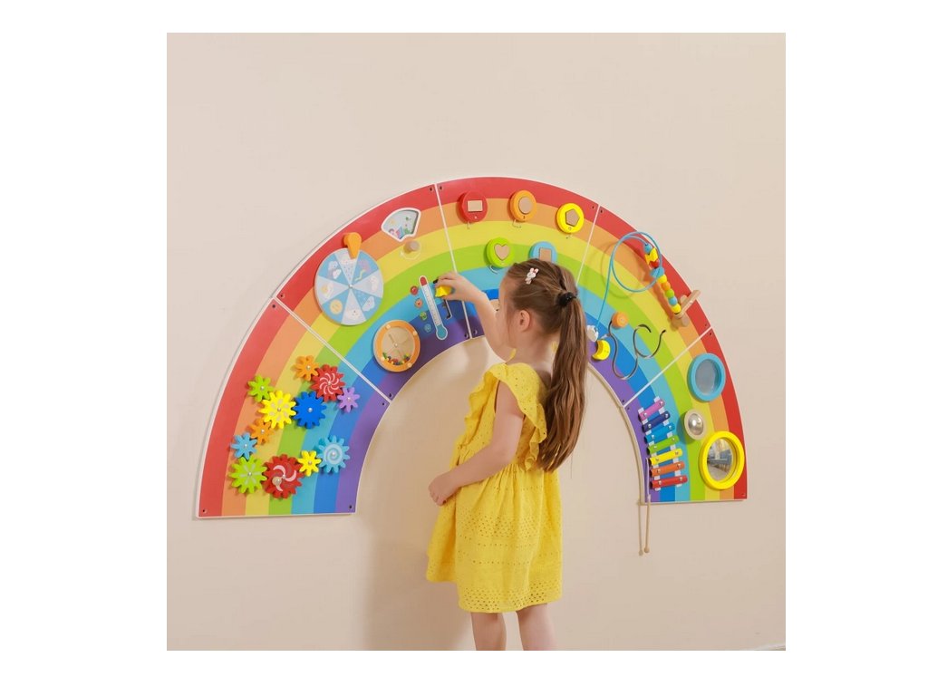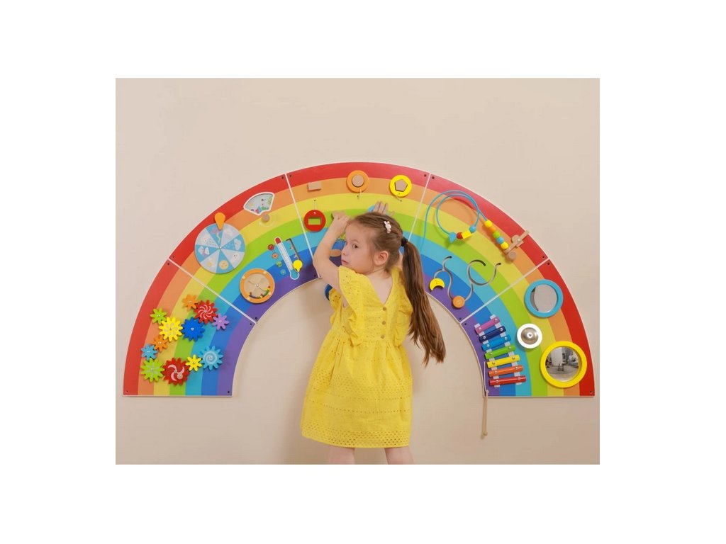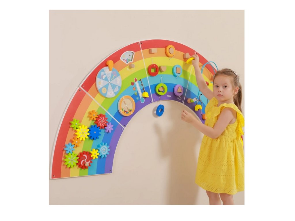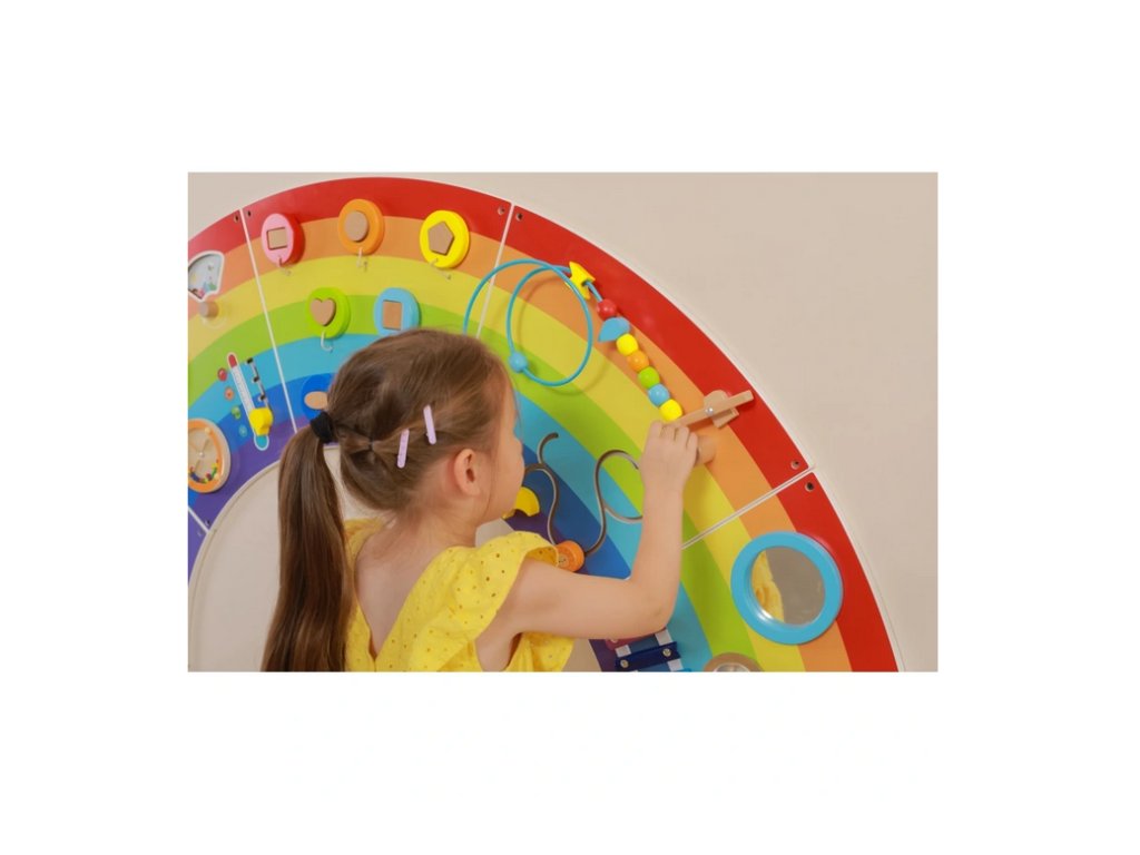 Montessori dřevěná smyslová a manipulační deska ve tvaru duhy přitahuje pozornost a podporuje hru.