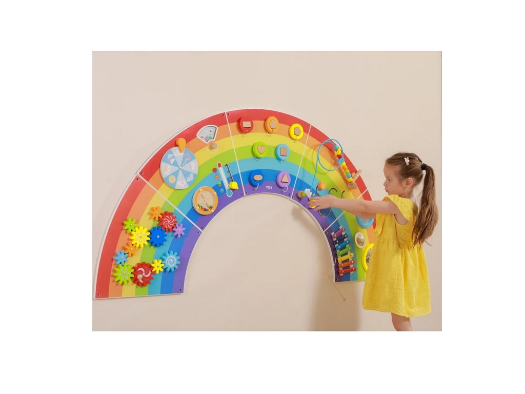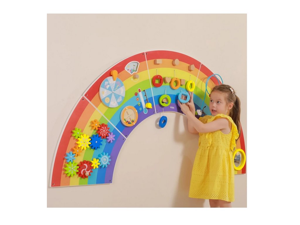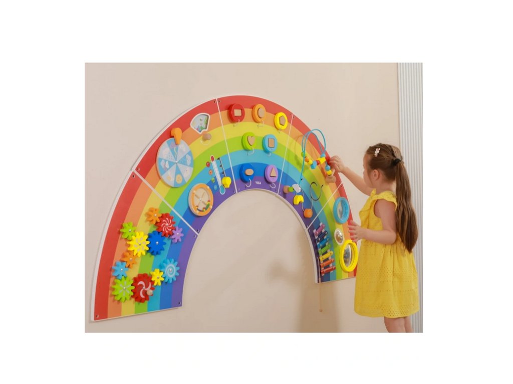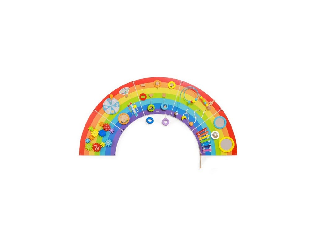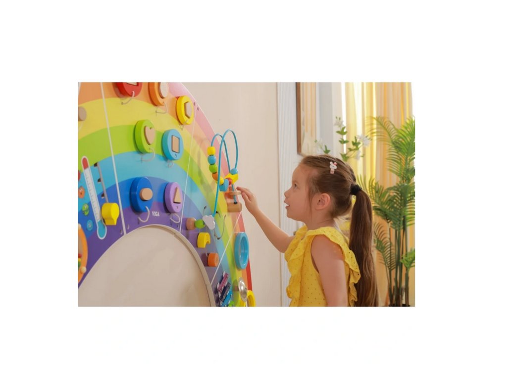 Montessori dřevěná smyslová a manipulační deska ve tvaru duhy přitahuje pozornost a podporuje hru.