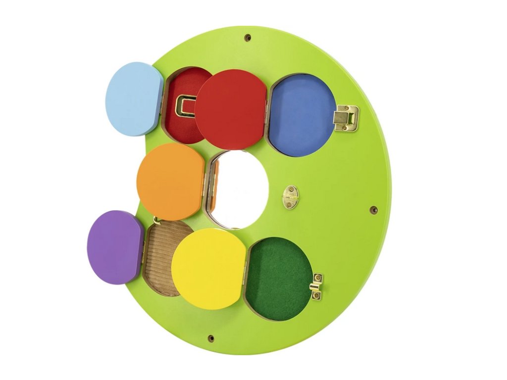 - Na čtvrté desce je 5 druhů zámků. Po otevření každého z nich se dítě může seznámit s 5 různými materiály (EVA, suchý zip, zrcadlo, plstěná látka, vlnitá lepenka).
