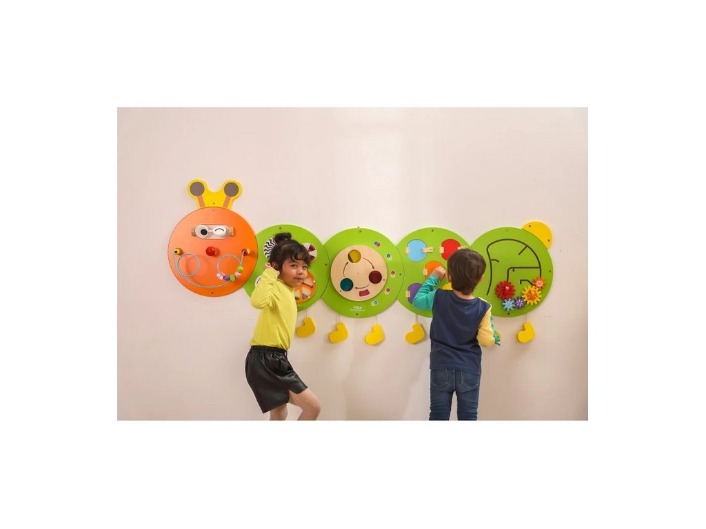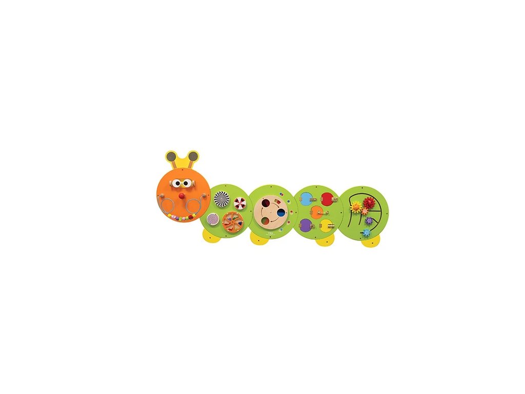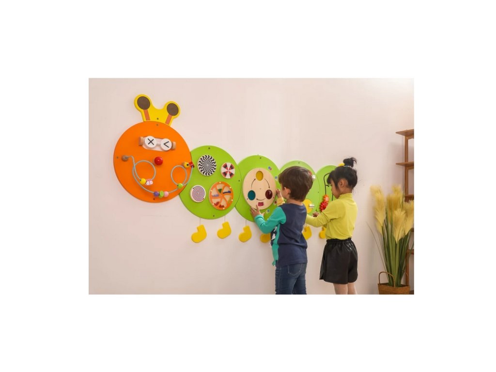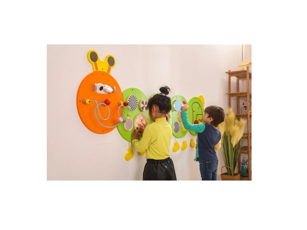 Nástěnná tabule s obrázkem housenky je hračka, na které si může hrát několik dětí najednou. Mohou si hrát nejen pro radost, ale také se toho hodně naučit.