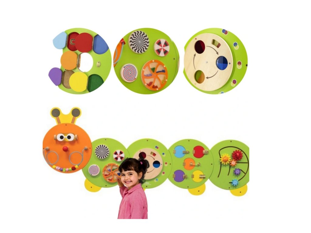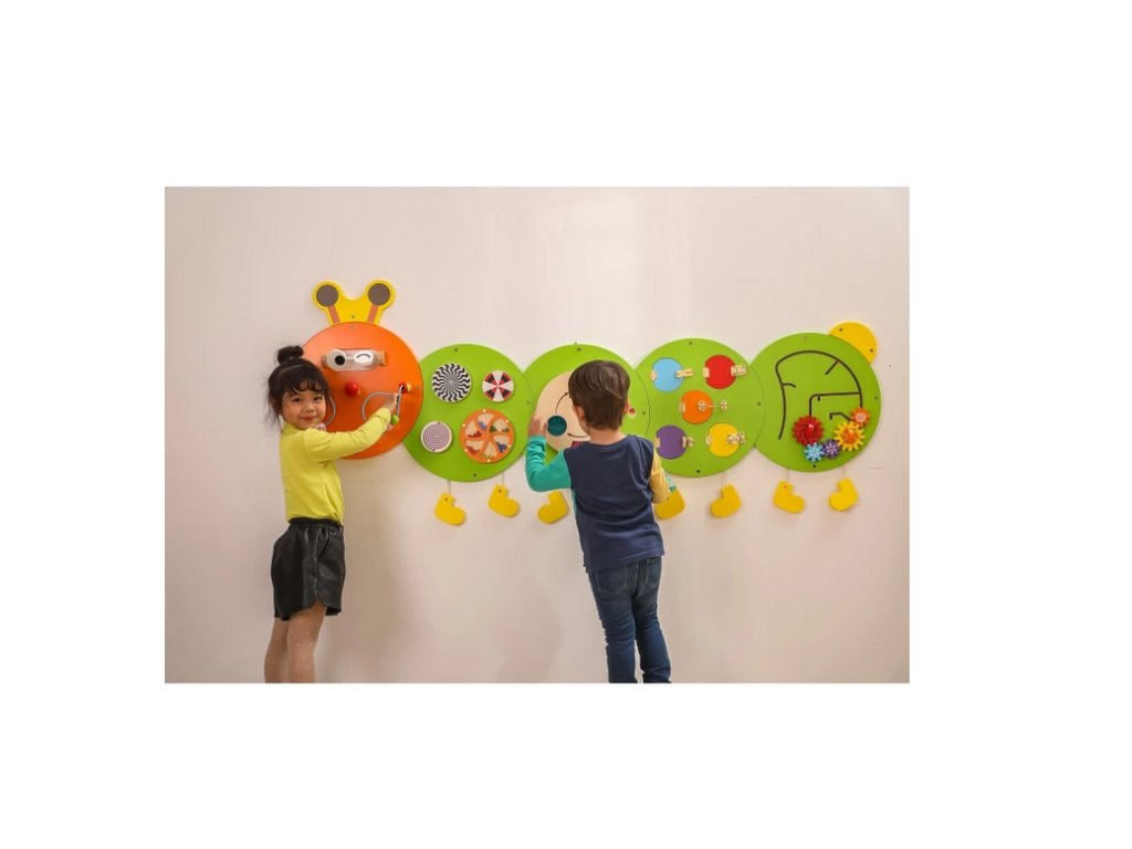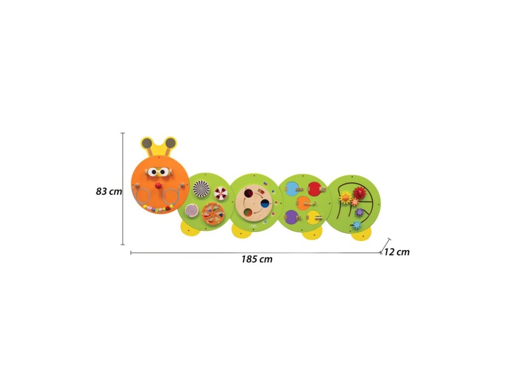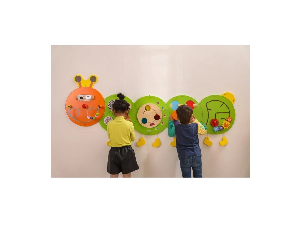 Nástěnná tabule s obrázkem housenky je hračka, na které si může hrát několik dětí najednou. Mohou si hrát nejen pro radost, ale také se toho hodně naučit.
