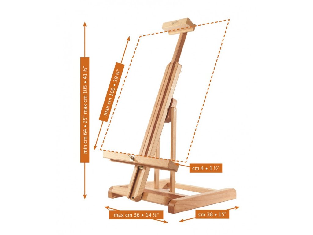 Stolní malířský stojan s možností umístění plátna i přes hranu stolu. Díky tomuto provedení stojan nastavíte do ideální pozice nehledě na výšce stolu a židle. Náklon až do vodorovné polohy. Masivní bukové dřevo, kvalitní provedení italské značky Mabef.