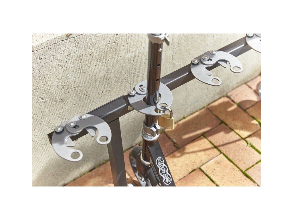 - klipové držáky lze sevřít pro větší stabilitu vložené koloběžky a uzamknout visacím zámkem, kabelem apod.