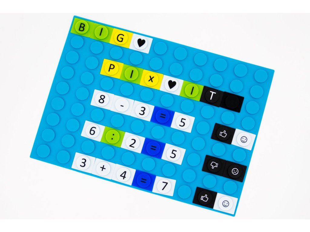 PIX-IT BIG je větší varianta stavebnice PIX-IT, balení obsahuje 4x silikonová modrá deska a 4x 180 silikonových dílků potištěných písmeny, čísly, znaménky, tvary, emoji, ...