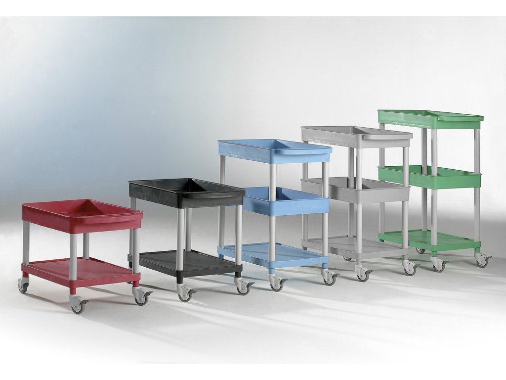Velká nosnost, mělké, v horní části hluboké plastové tácky, konstrukce tvořená z plastových trubek, opatřeno kolečky s aretací.